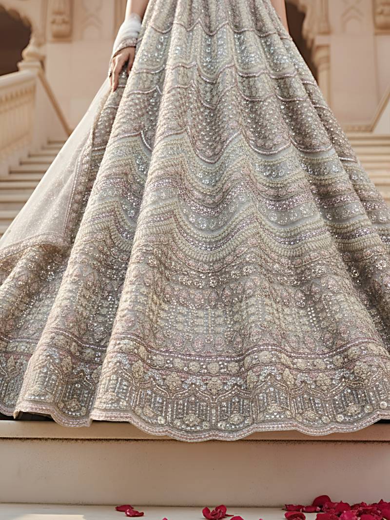 Delightful off-white handwork crystal pipe, handwork beads, sequins and dori embroidered net lehenga choli for wedding