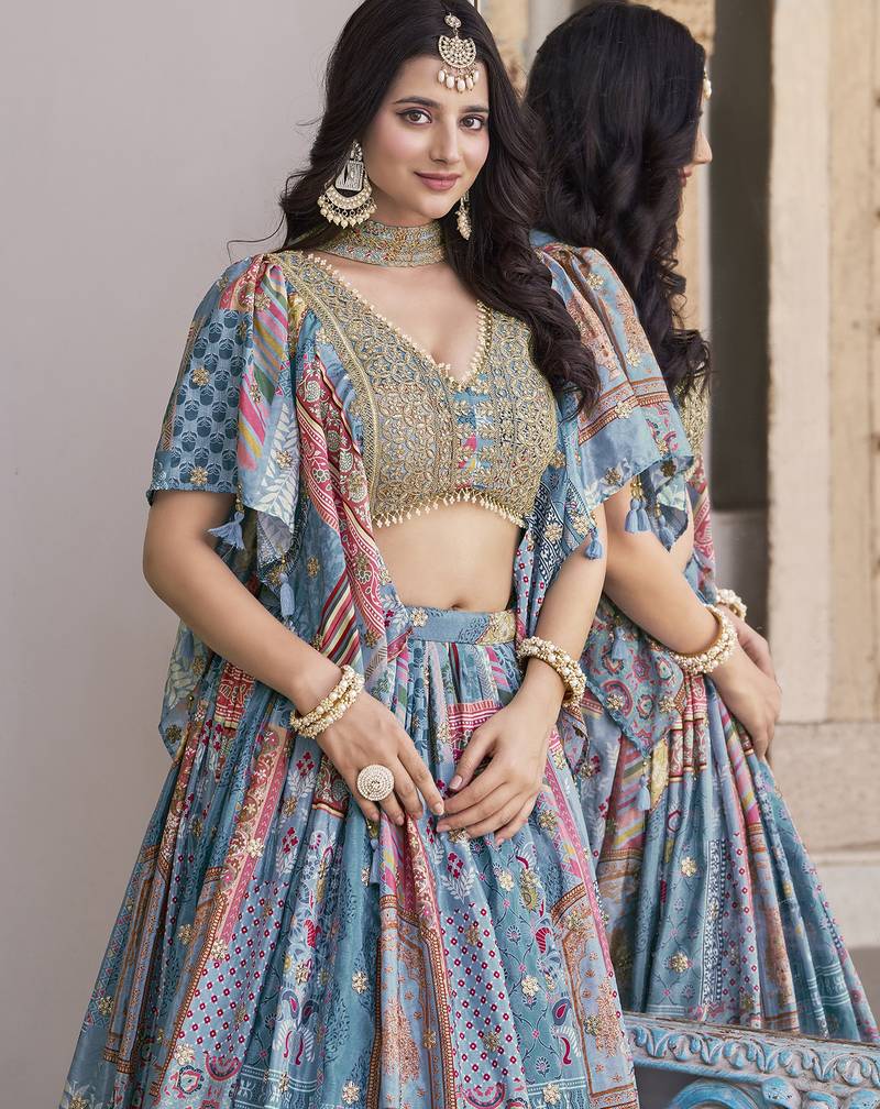 | Product Name | Gorgeous Sky Blue Digital Printed With Dori And Zari Embroidered Chinnon Silk Fabric Indian Wedding And Party Lehenga | |