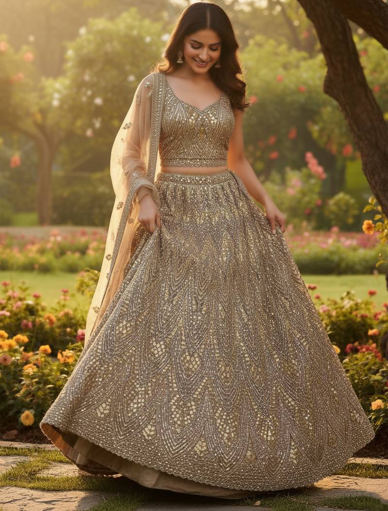 Intriguing golden fancy pattern, sequins, dori embroidered, zircon diamond studded net wedding lehengas for women