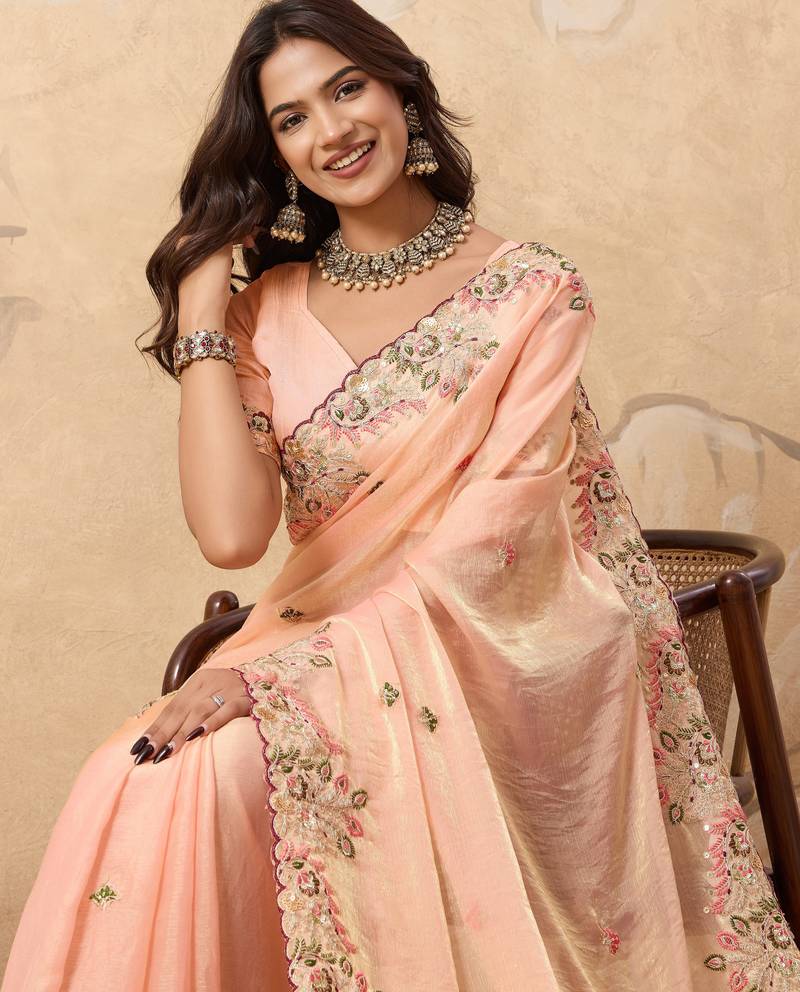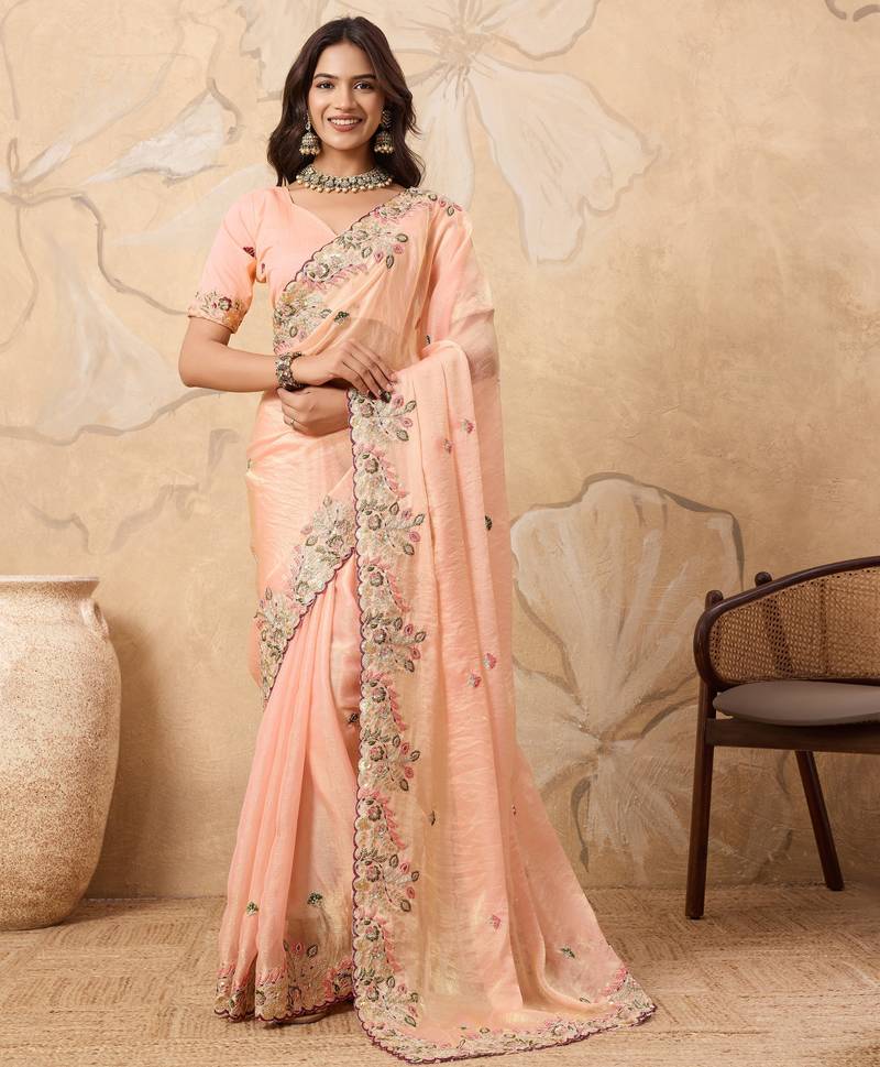 | • | Saree | : | Color- Peach / Fabric- Chiffon |
