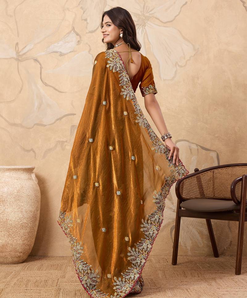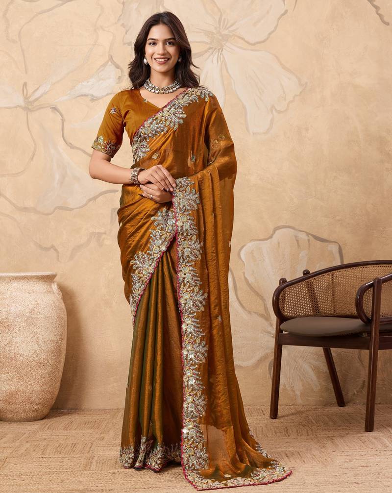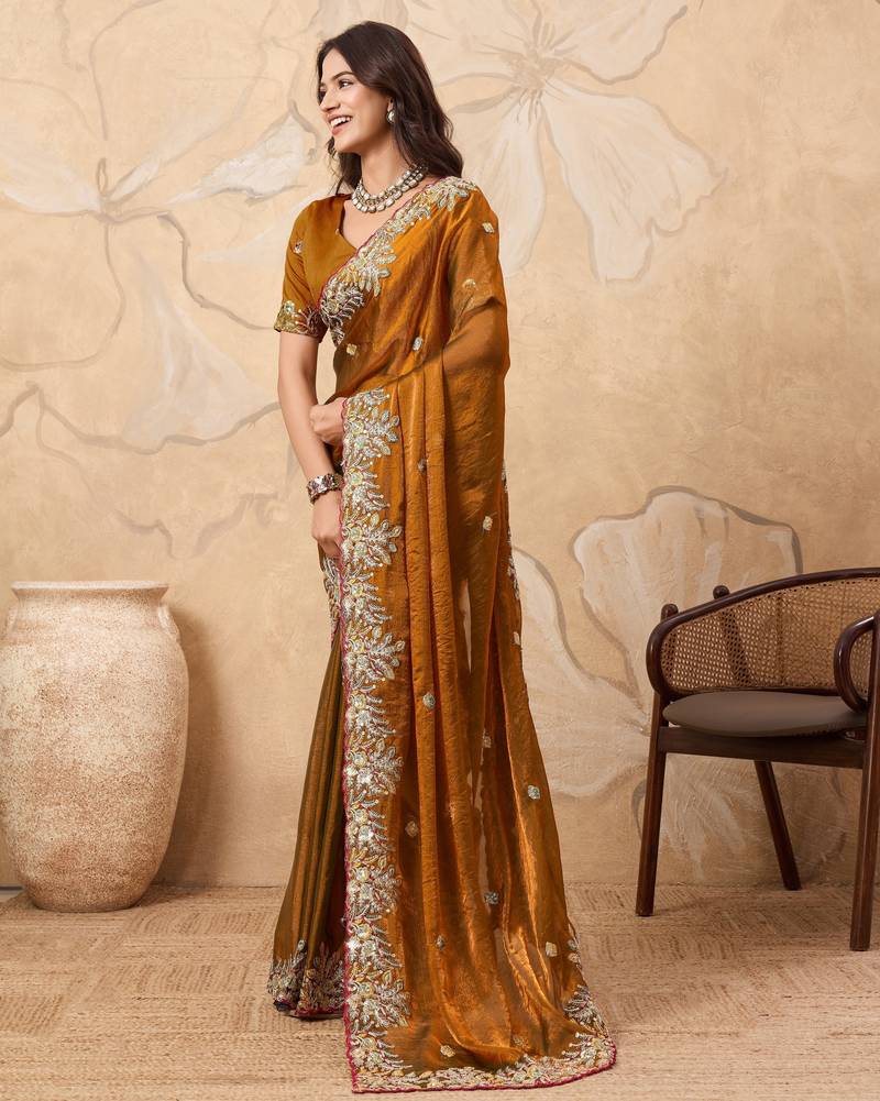 | • | Saree | : | Color- Mustard / Fabric- Chiffon |