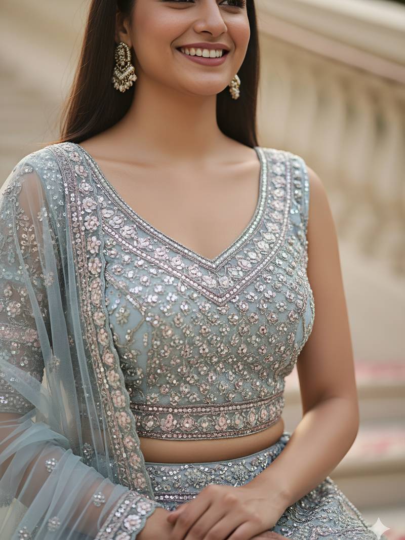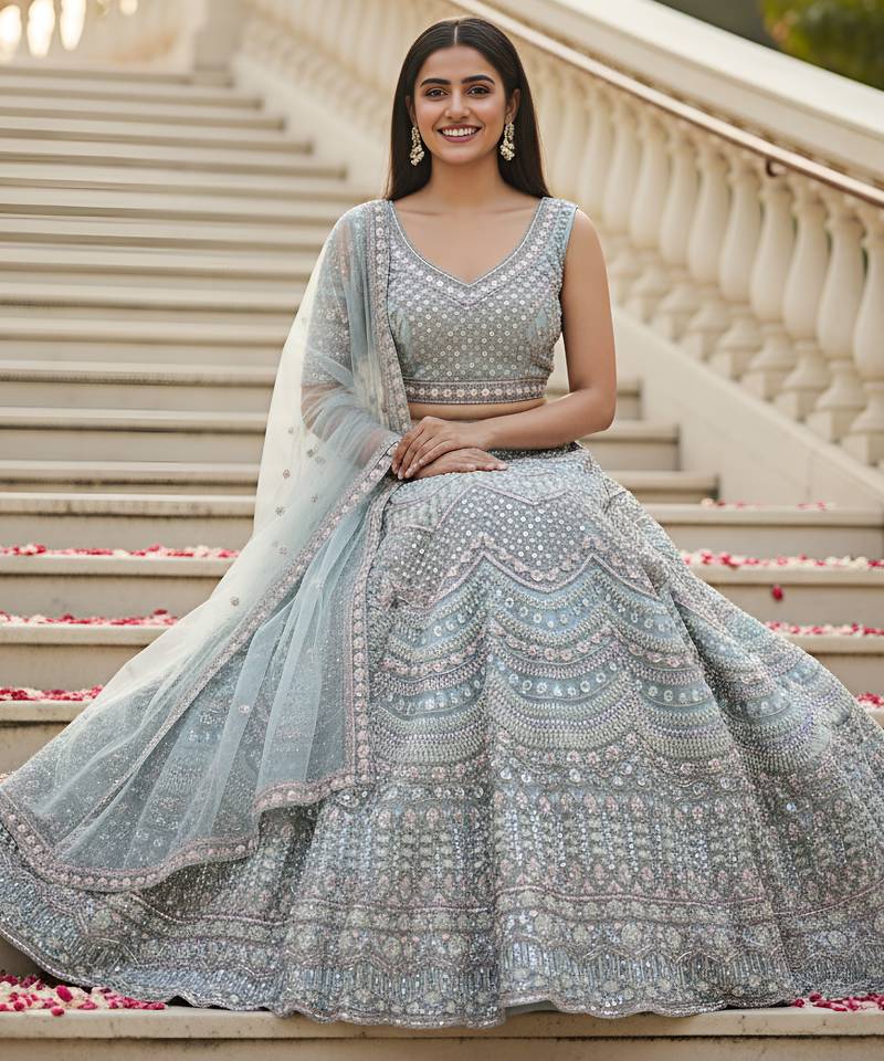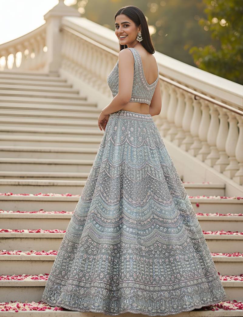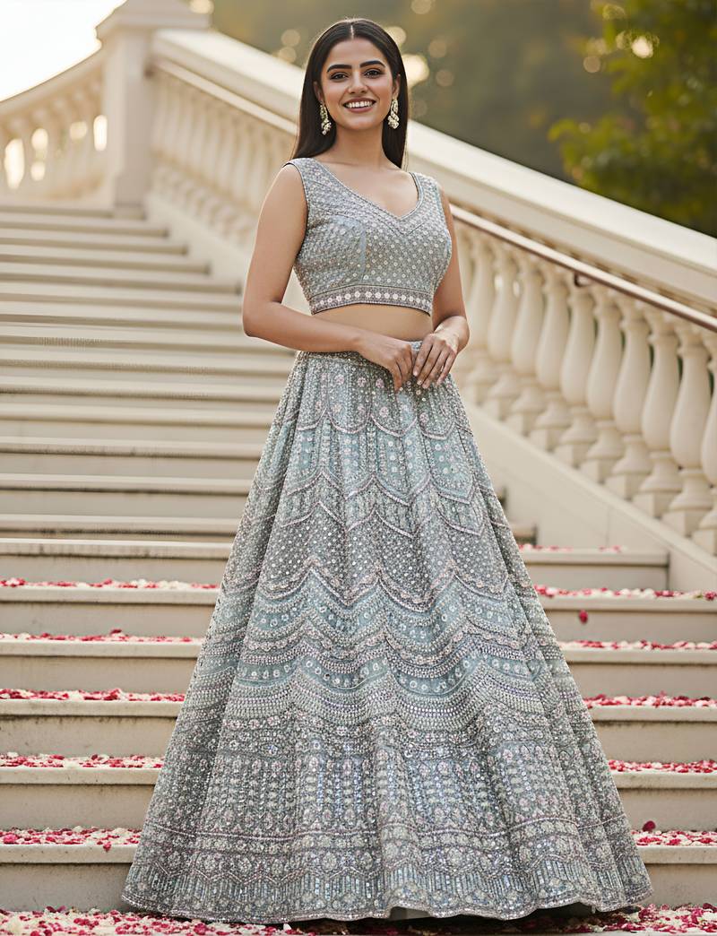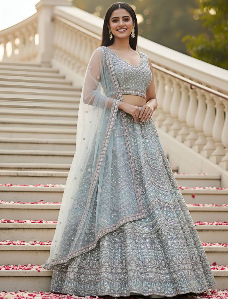 | Product Name | Mesmerizing Sky Handwork Crystal Pipe, Handwork Beads, Sequins And Dori Embroidered Net Wedding Lehenga Choli | |