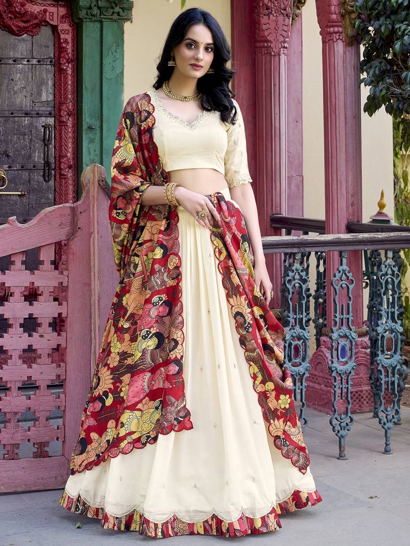 | Product Name | Off White Vichitra Silk Sequins And Thread Embroidered With Kalamkari Print Border Lehenga Choli Dress | |