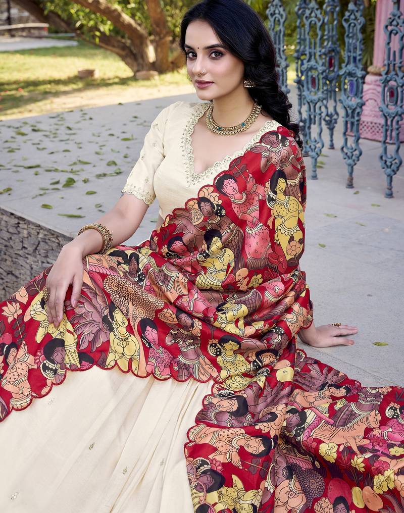 Off-white vichitra silk sequins and thread embroidered with kalamkari print border lehenga choli dress