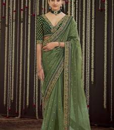 Graceful olive green thread, sequins embroidered organza saree with blouse