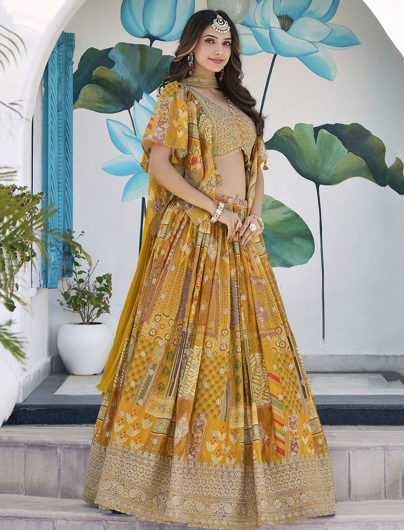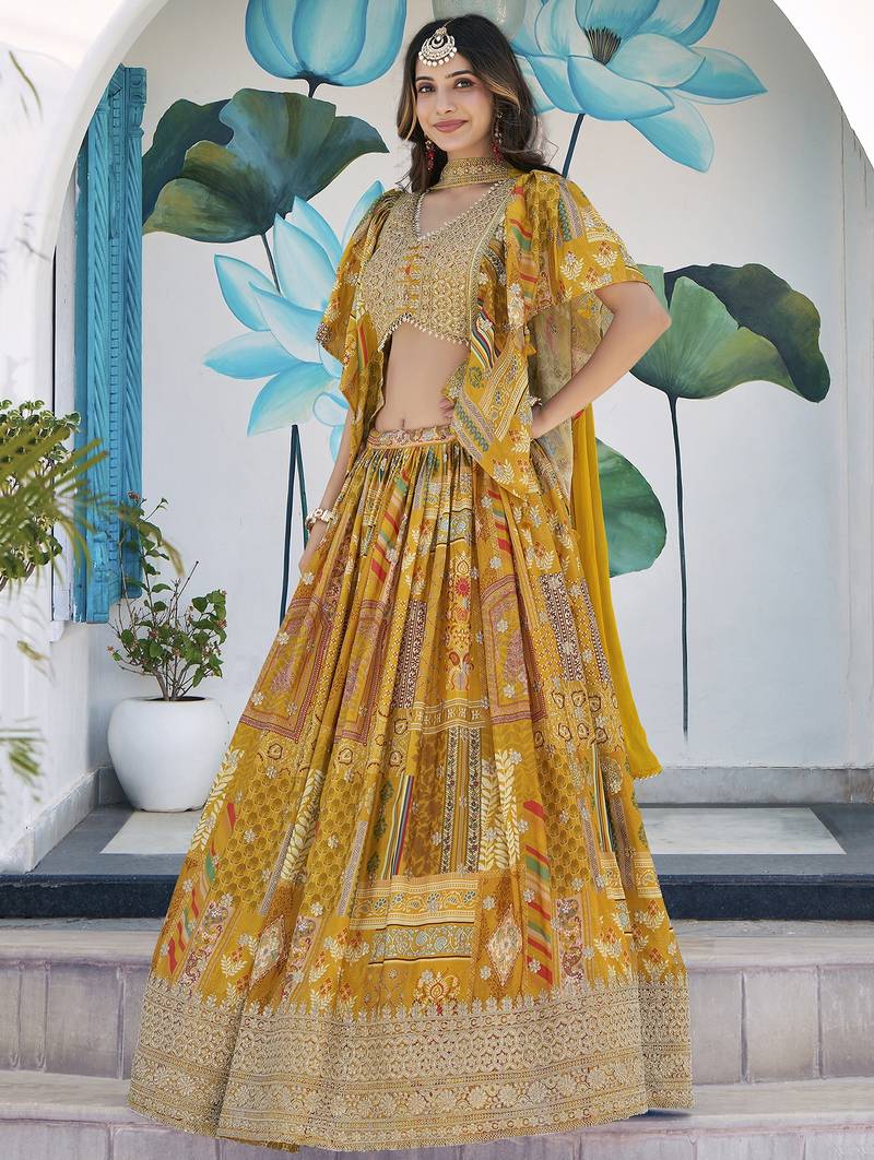 Phenomenal yellow digital printed with dori & zari embroidered chinnon silk fabric indain designer party lehenga dress