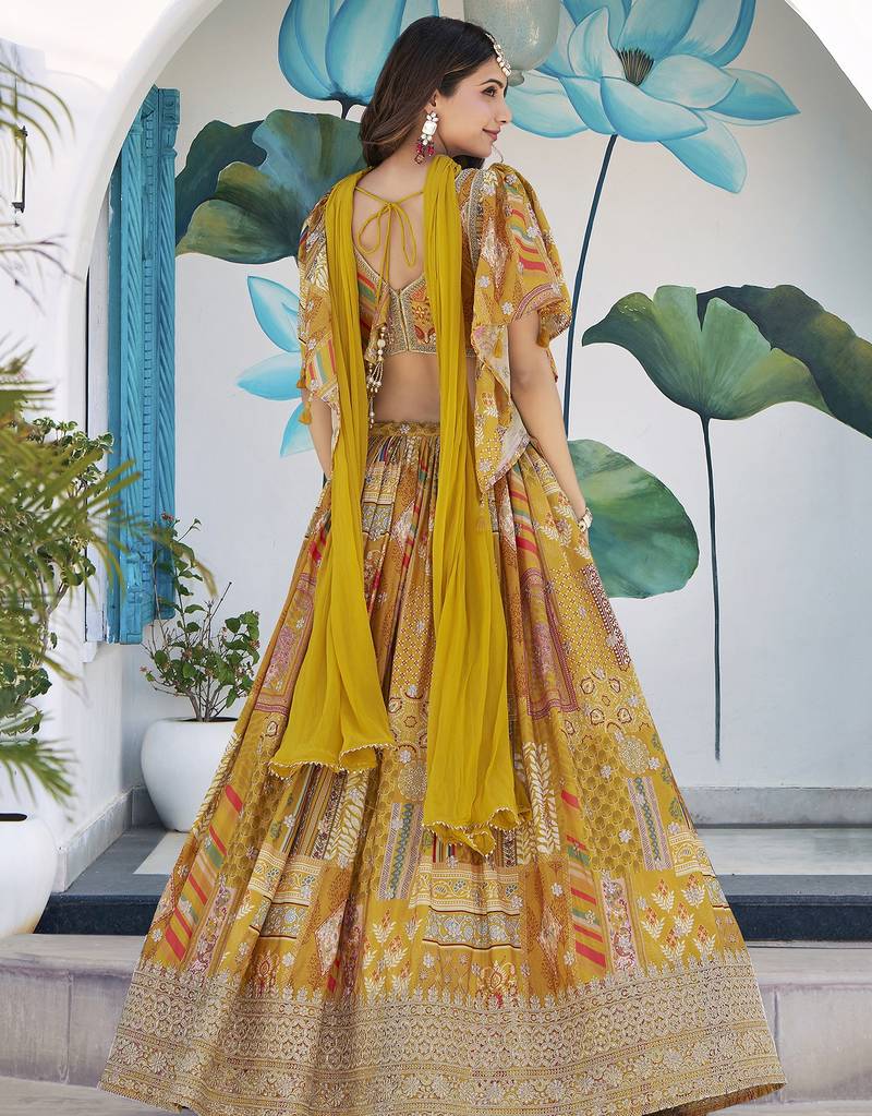 | Product Name | Phenomenal Yellow Digital Printed With Dori & Zari Embroidered Chinnon Silk Fabric Indain Designer Party Lehenga Dress | |
