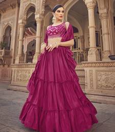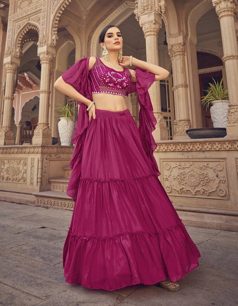 Pink thread embroidered with mirror work chinon semi stitched party wear lehenga choli