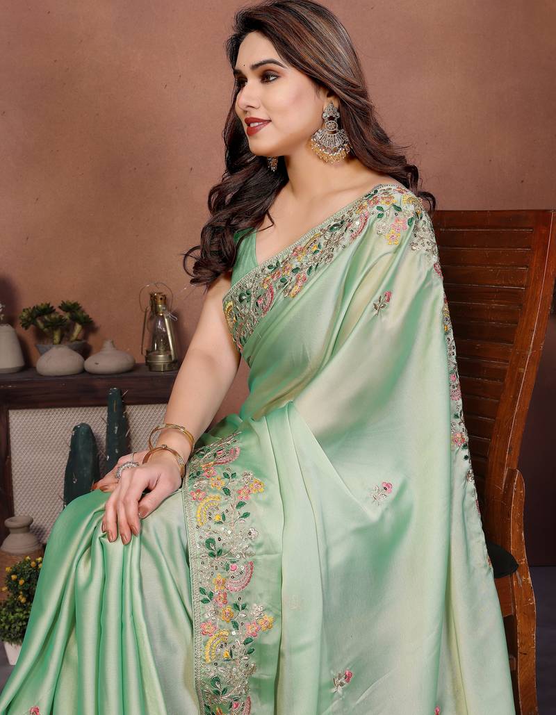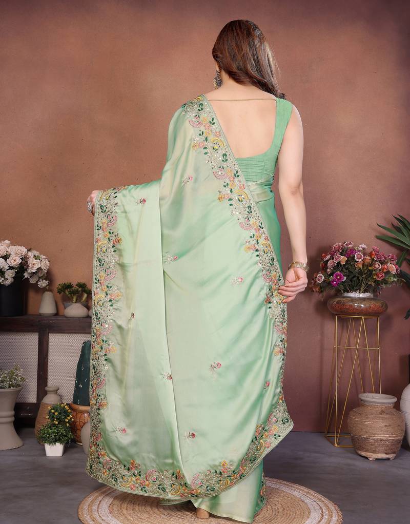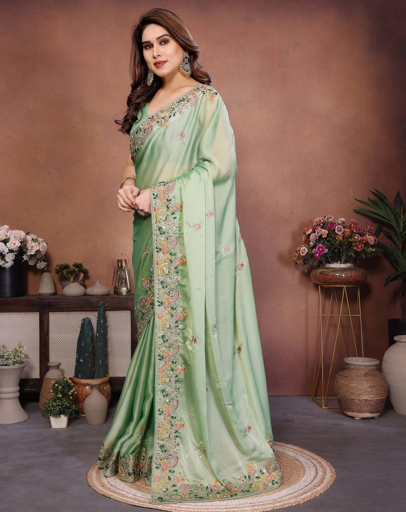 Prepossessing pista green frendy chiffon embroidery multi sequence work. saree with mono banglory silk blouse