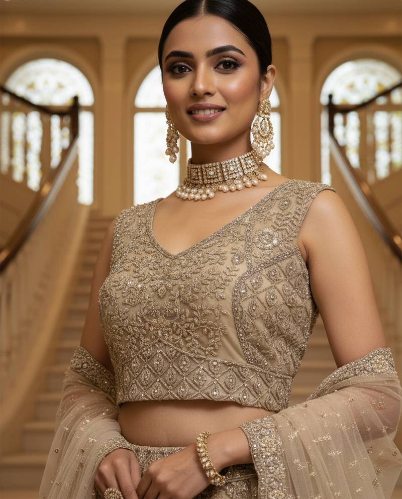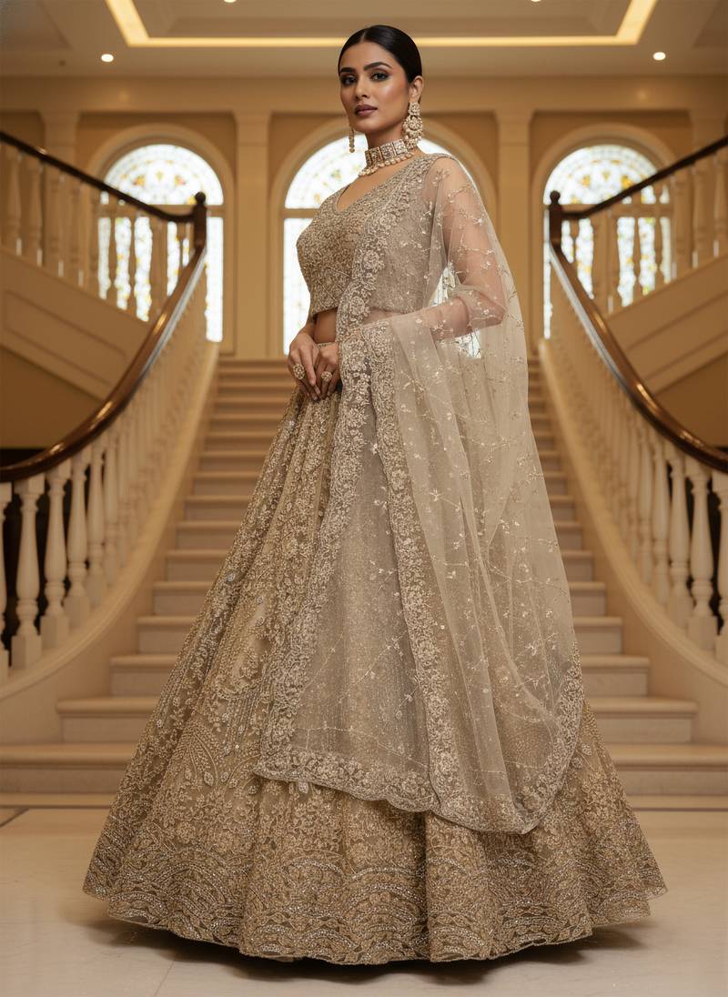 | Product Name | Seductive Golden White Pearl Beads, Thread Work, Zari And Dori Embroidered, Zircon Diamond Heavy Net Lehenga Choli | |
