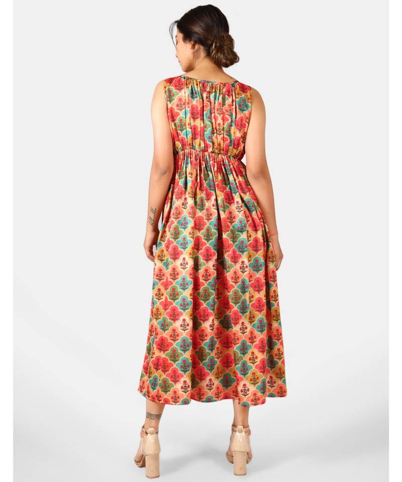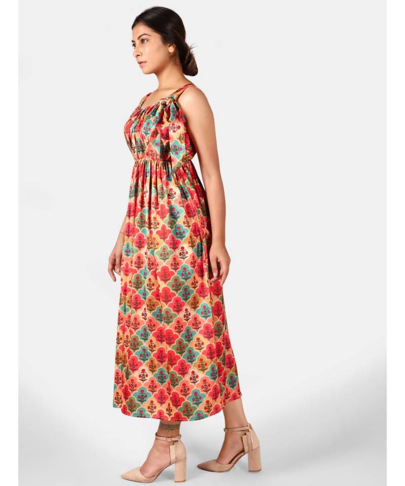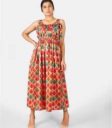 | Product Description | Long, Sleeves Less All Over Printed Dress It Has A Tie Up Pattern At The Neck Line And All Over Elastic At The Waist Line . |