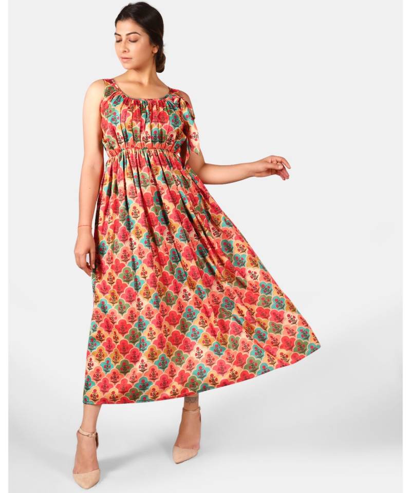 | Product Name | Orange Geometric Digital Printed Ankle Length Tunic Dress | |