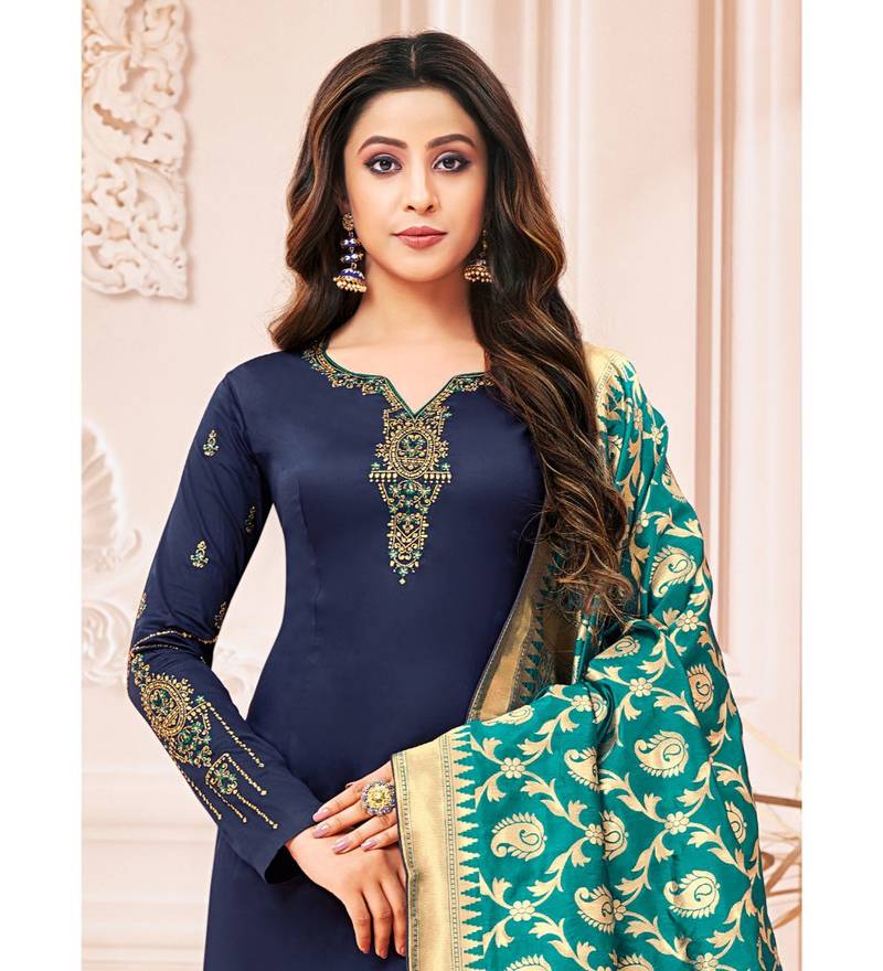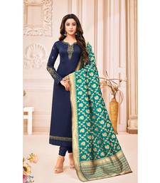 Navy blue & teal cotton jam silk women's salwar suit with banarasi dupatta unstitched