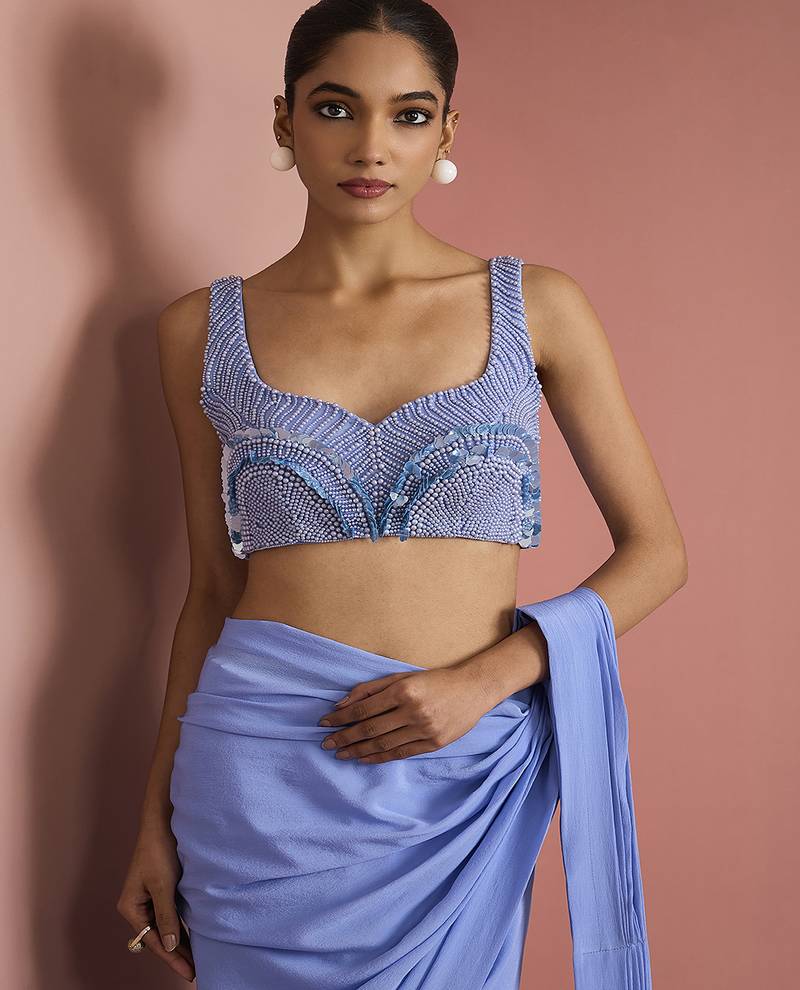 | Product Name | Blue Crepe Drape Saree With Pearl Work Blouse | |