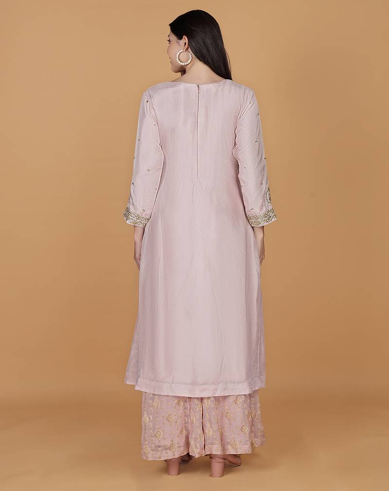 Light pink viscose silk pearl sequins dubka work sharara set stitched