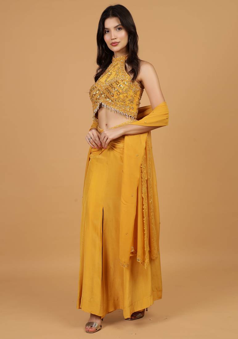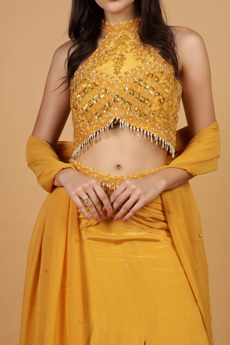 | Product Name | Mustard Sequins Crepe Fish Cut Lehenga Set | |