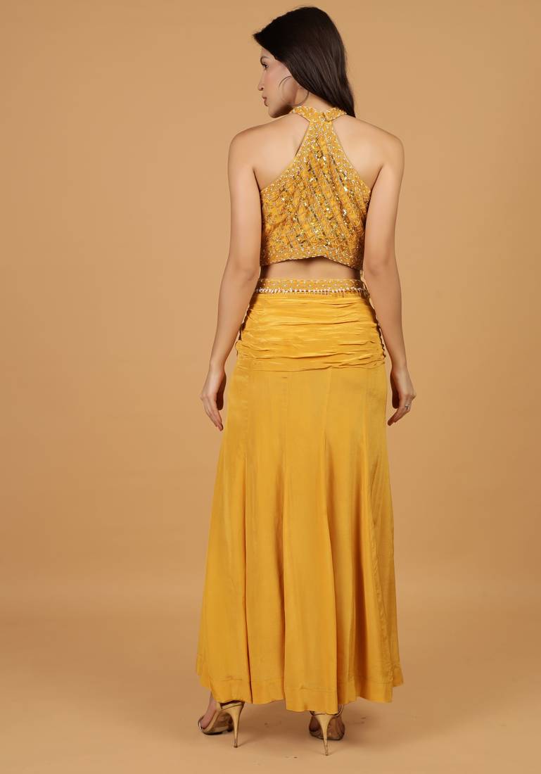 Mustard sequins crepe fish cut lehenga set