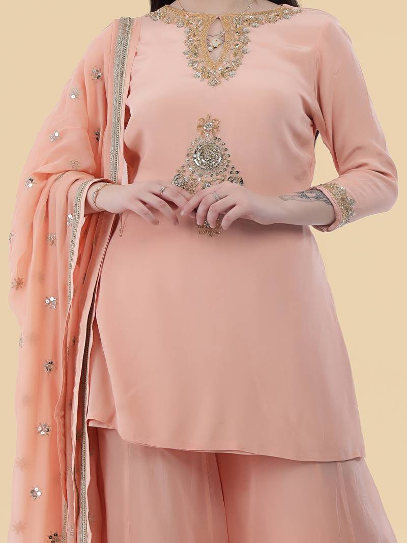Peach crepe kurta sharara set stitched