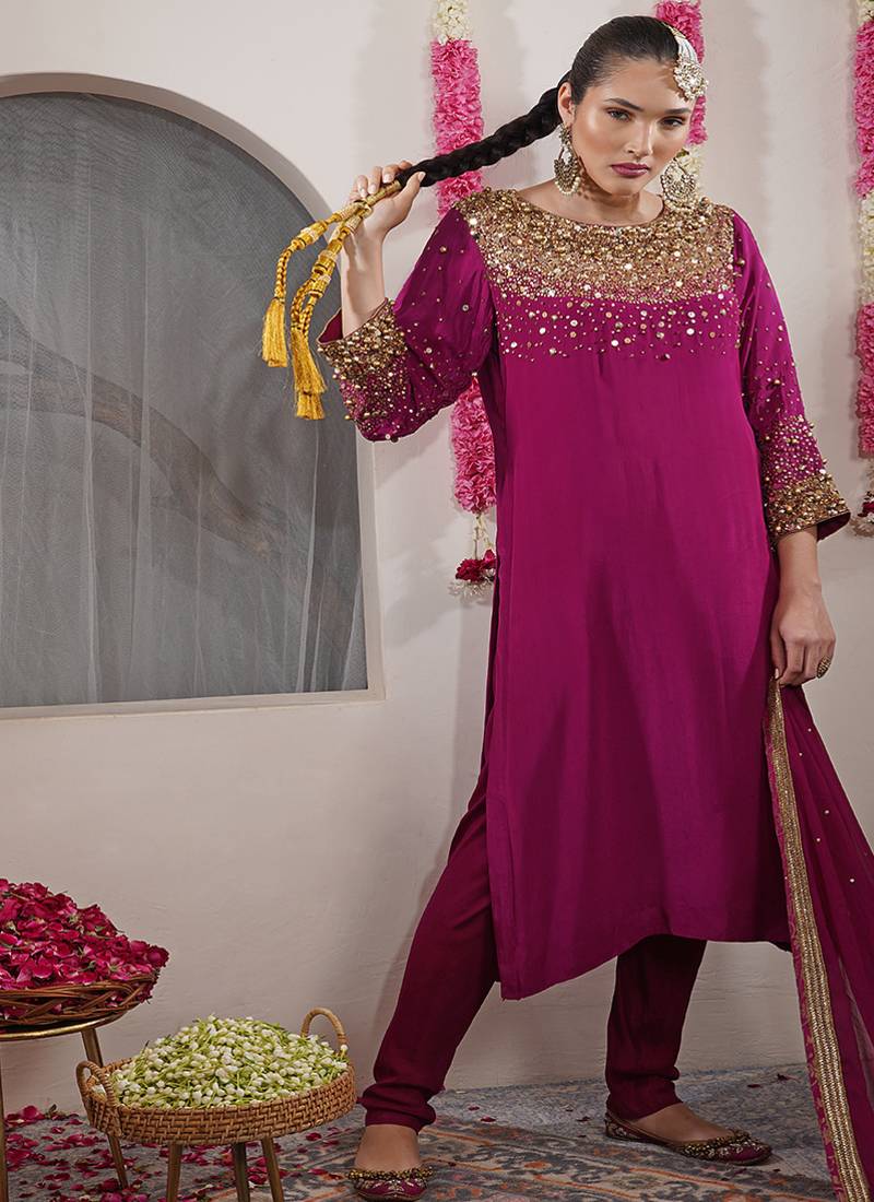 | Product Name | Wine Beadwork And Sequin Crepe Kurta And Churidar Dupatta Set | |