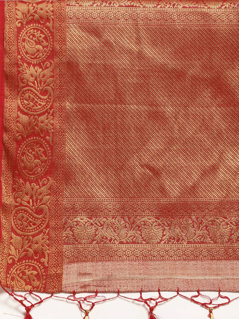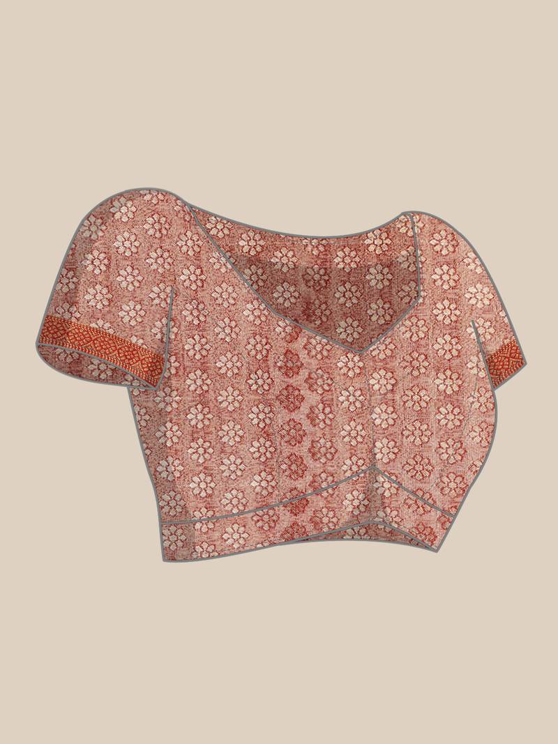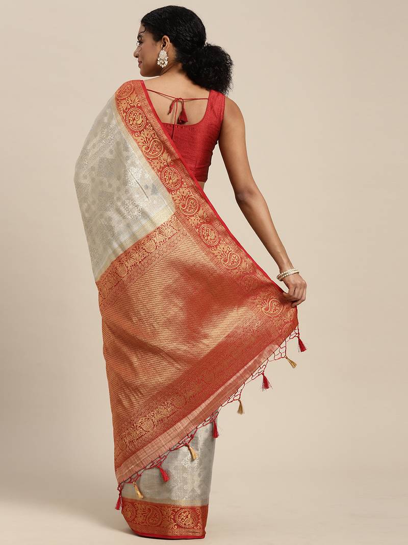 | Product Description | Grey Color Traditional Saree, With Woven Mixture Of Zari And Gicha Thread Design All Over , Has Zari Woven Border And Pallu And Tussel Work At The End , Comes With Rust Color Contrast Unstiched Brocade Blouse (Attached At The Last Of Saree) |