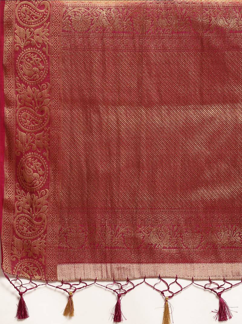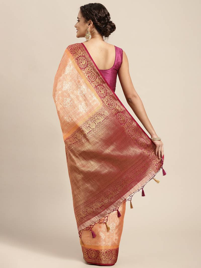 | Product Description | Orange Color Traditional Saree, With Woven Mixture Of Zari And Gicha Thread Design All Over , Has Zari Woven Border And Pallu And Tussel Work At The End , Comes With Purple Color Contrast Unstiched Brocade Blouse (Attached At The Last Of Saree) |
