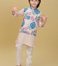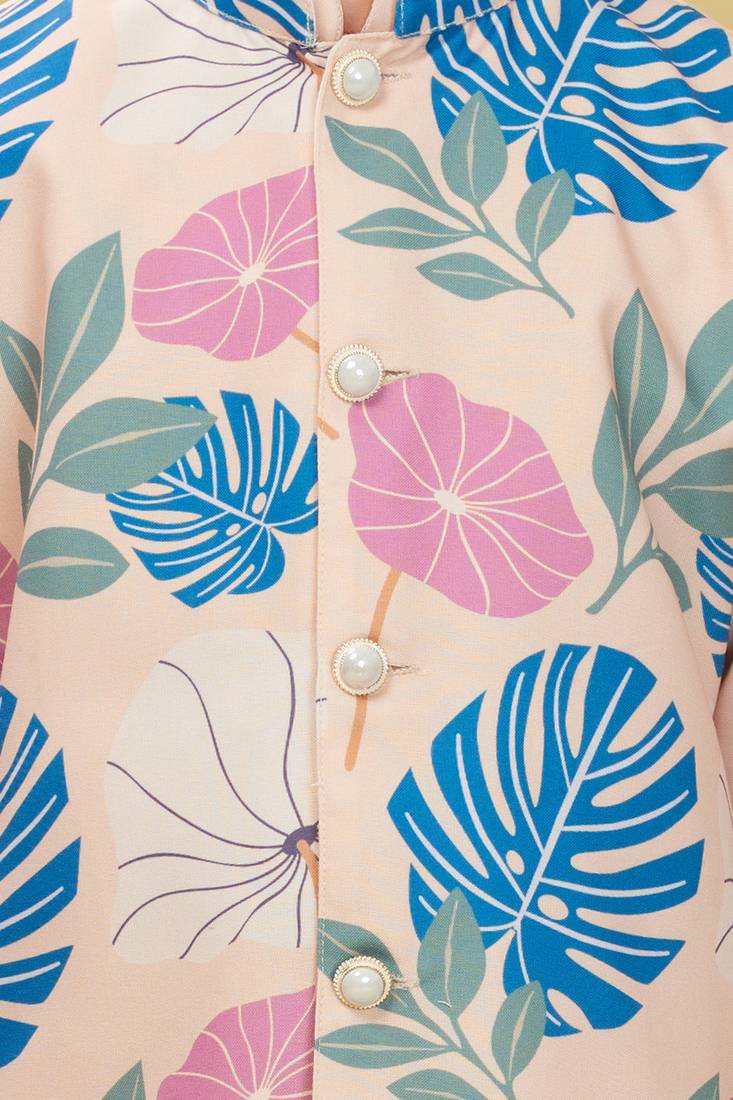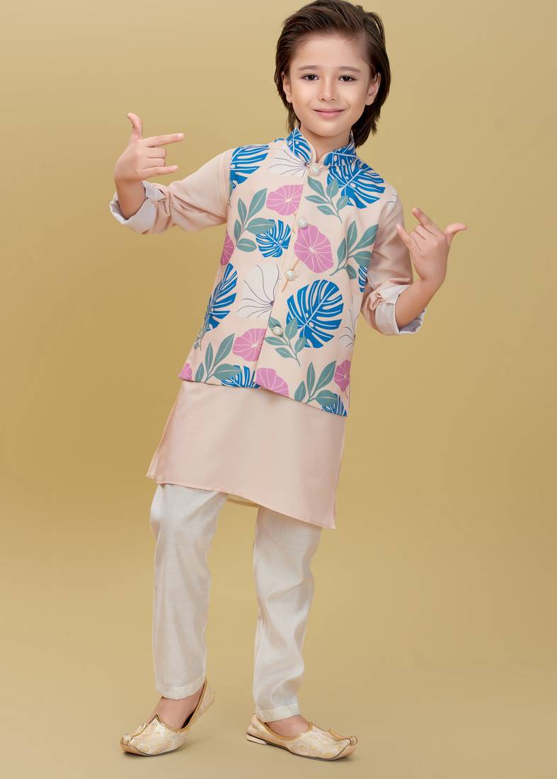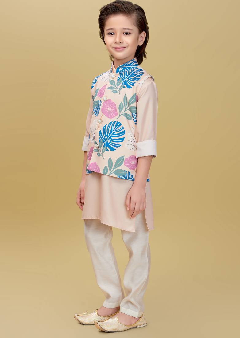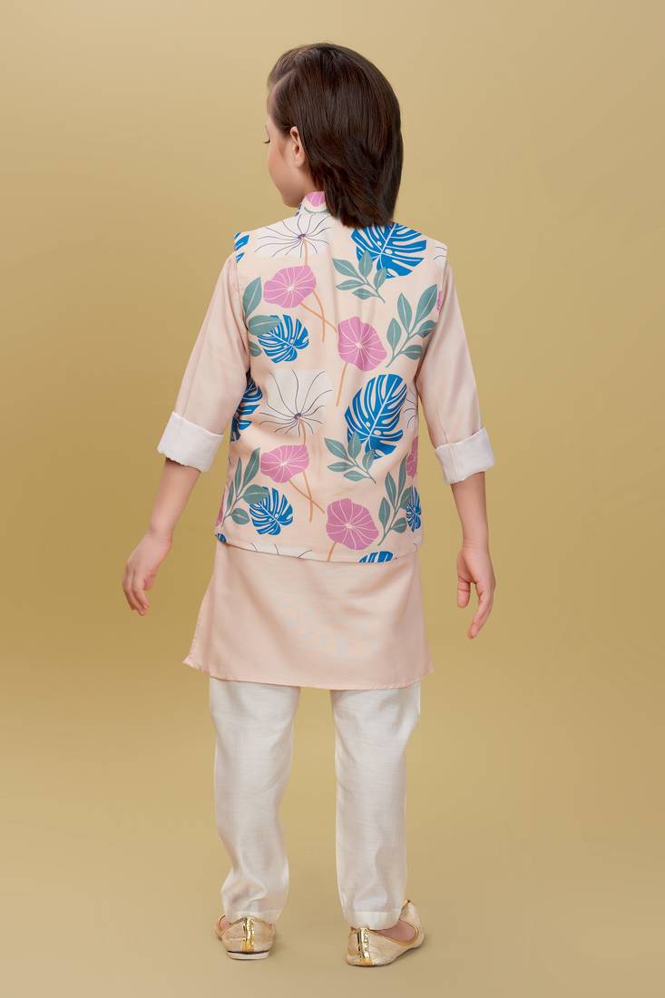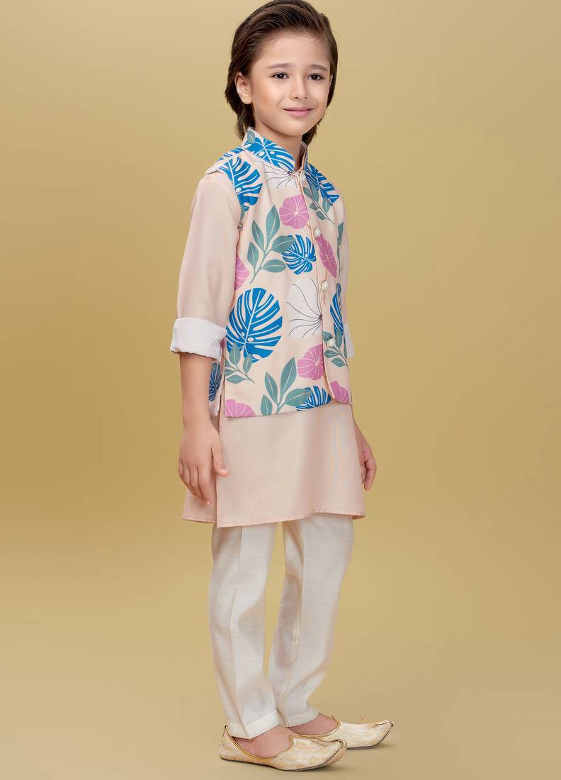 | Product Description | Add A Refreshing Charm To Your Little One’s Festive Look With This Pastel Peach Kurta Set Featuring A Stylish Printed Nehru Jacket. The Jacket Showcases Tropical Leaf And Floral Prints In Soothing Shades Of Blue, Pink, And Green, Accented With Elegant Pearl Buttons For A Polished Finish. The Set Includes A Solid Peach Kurta And White Churidar, Crafted From Soft, Breathable Fabric For All Day Comfort. Perfect For Festive Occasions, Weddings, And Family Celebrations. |