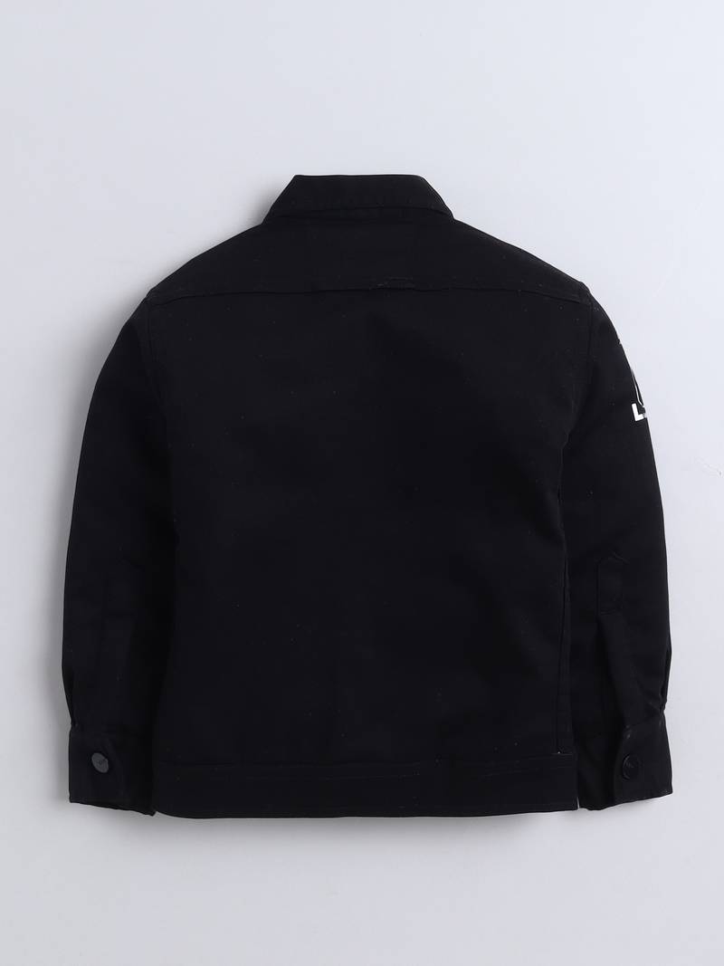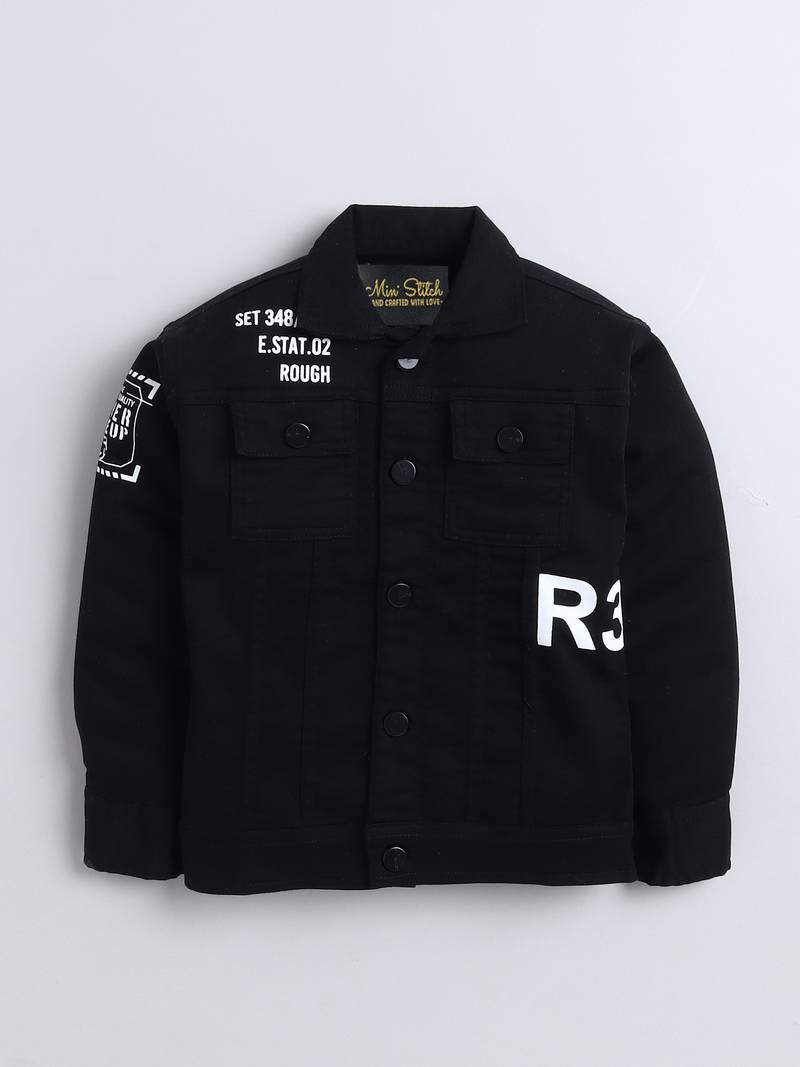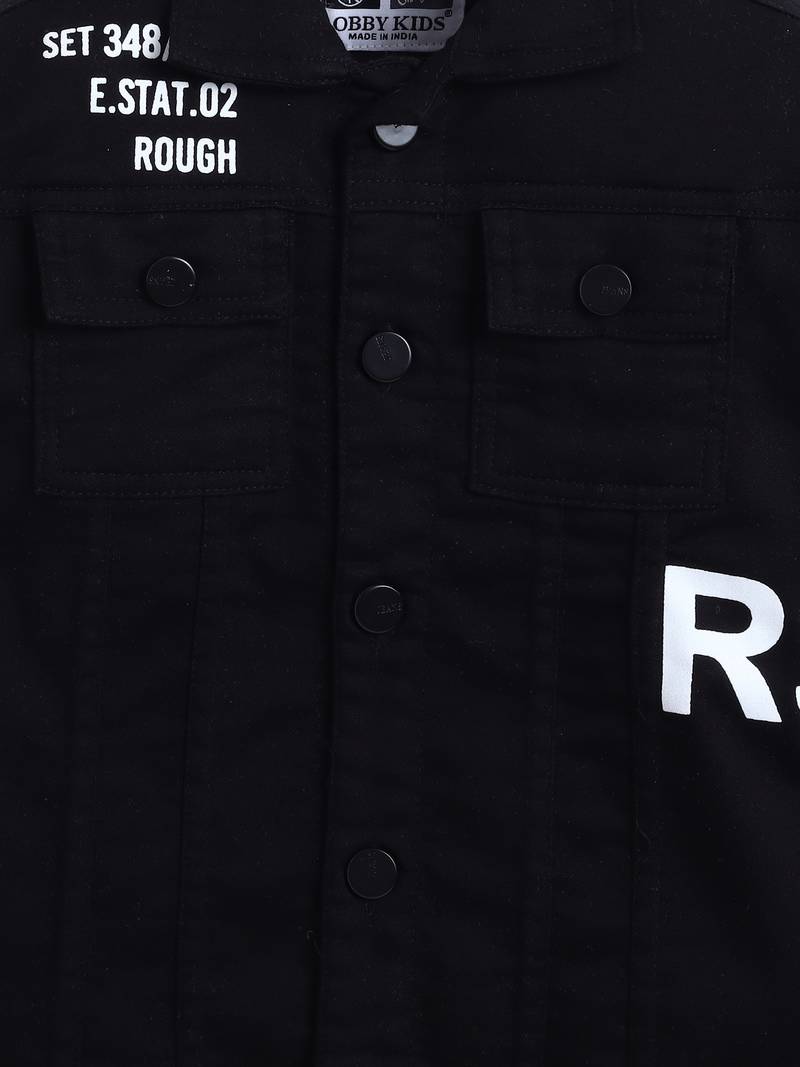 | Product Description | This Trendy Kids' Outfit Includes A Black Denim Jacket Designed With A Modern Twist. The Jacket Features Black Button Closures, Stylish Flap Pockets, And Bold Black Printed Text Details On The Chest And Sleeves For A Cool, Contemporary Feel. It Is Layered Over A White Printed T Shirt With Vertical And Horizontal Typography In Black And Mint Green, Adding A Fresh And Dynamic Contrast. This Outfit Is Perfect For Stylish Casual Outings And Gives Off A Playful Yet Polished Vibe. |