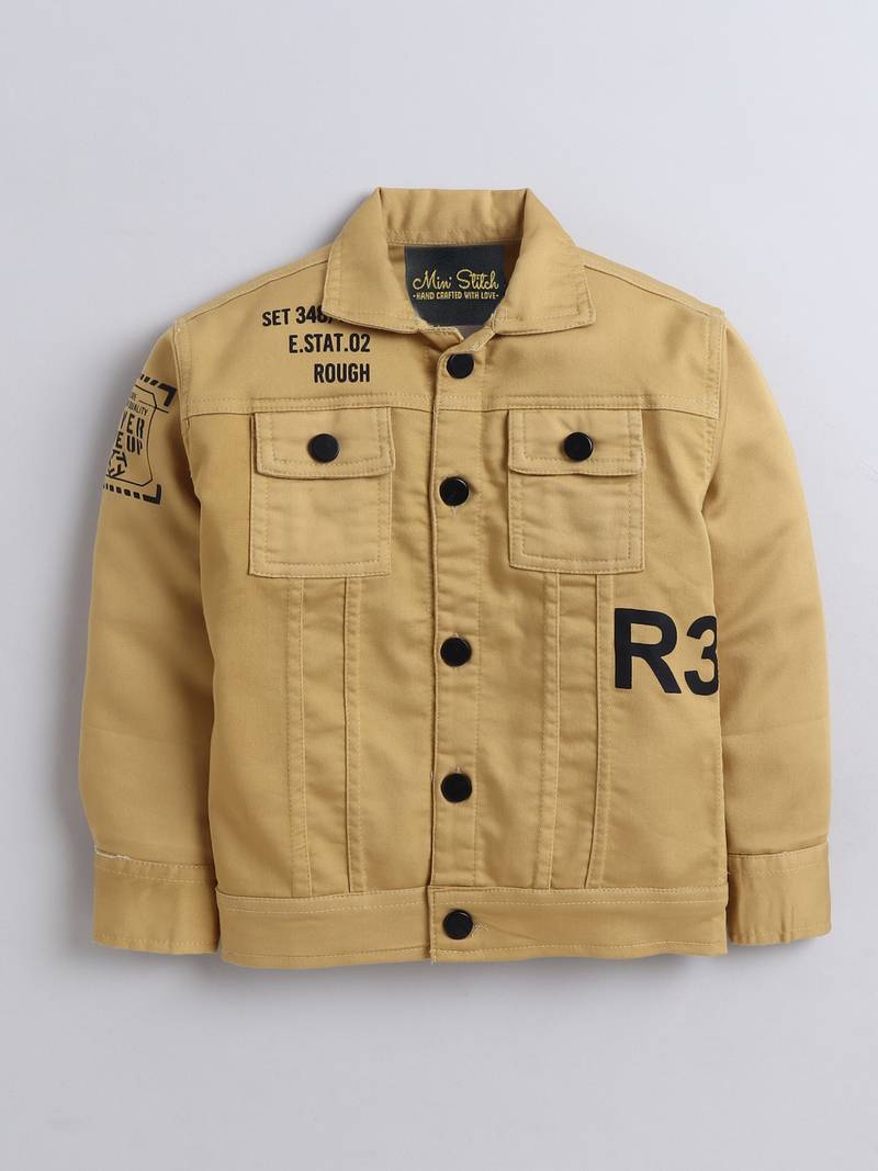 | Product Description | This Trendy Kids' Outfit Includes A Mustard Yellow Denim Jacket Designed With A Modern Twist. The Jacket Features Black Button Closures, Stylish Flap Pockets, And Bold Black Printed Text Details On The Chest And Sleeves For A Cool, Contemporary Feel. It Is Layered Over A White Printed T Shirt With Vertical And Horizontal Typography In Black And Mint Green, Adding A Fresh And Dynamic Contrast. This Outfit Is Perfect For Stylish Casual Outings And Gives Off A Playful Yet Polished Vibe. |