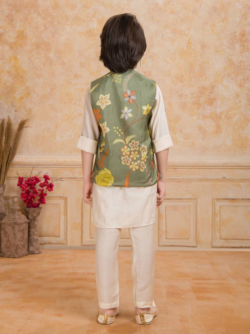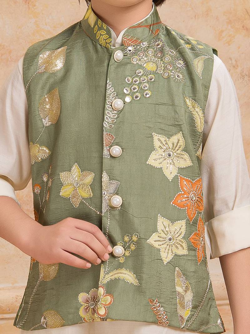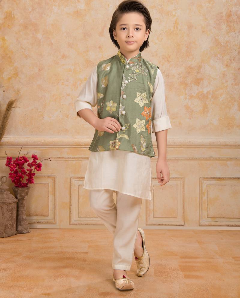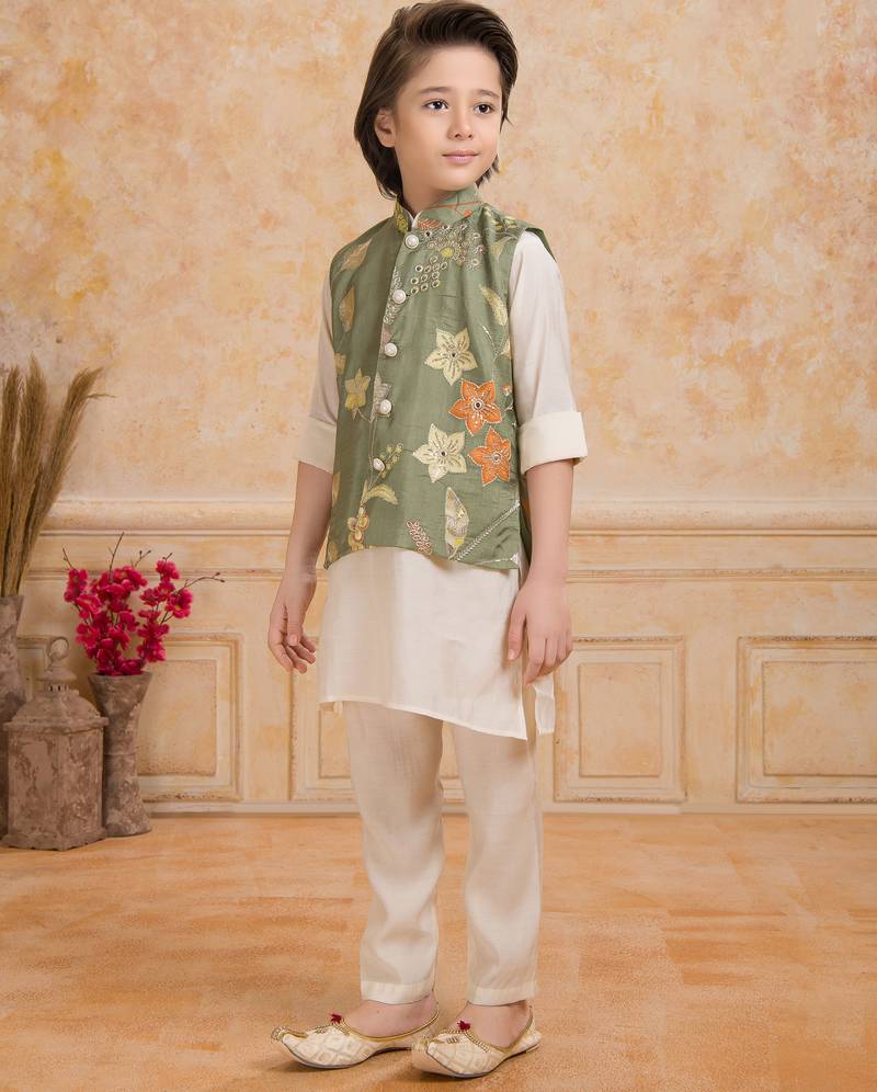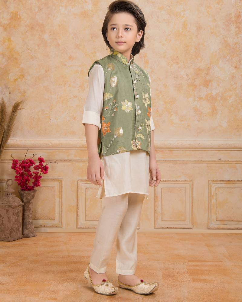 | Product Description | Dress Your Little One In This Elegant Ethnic Ensemble Featuring Olivegreen Floral Embriodered Nehru Jacket Paired With A Classic Offwhite Kurta And Payjama. The Jacket Is Adorned With Vibrant Floral Motifs And Pearl Button Detailing, Adding A Festive Charm To The Outfit. Made From Soft, Breathable Fabric, This Set Ensures All Day Comfort While Keeping The Look Traditional Yet Stylish — Perfect For Weddings, Festive Celebrations, Or Family Gatherings. |