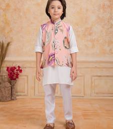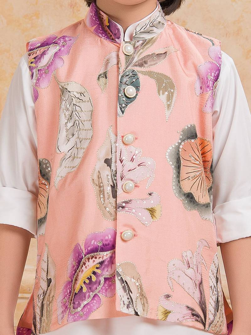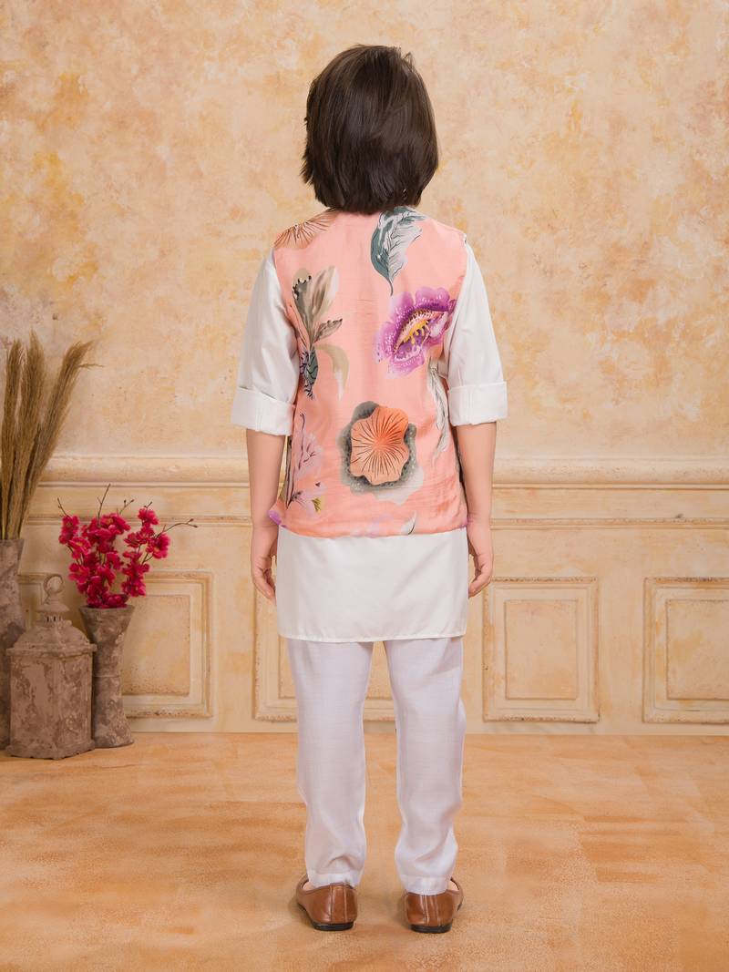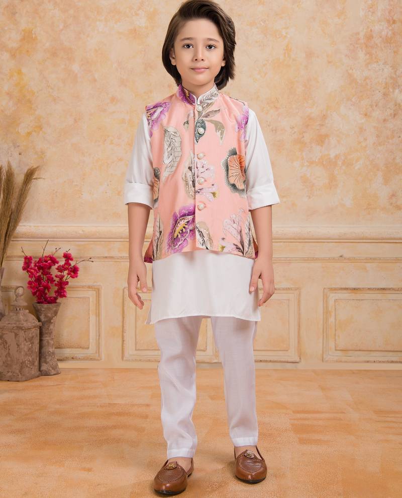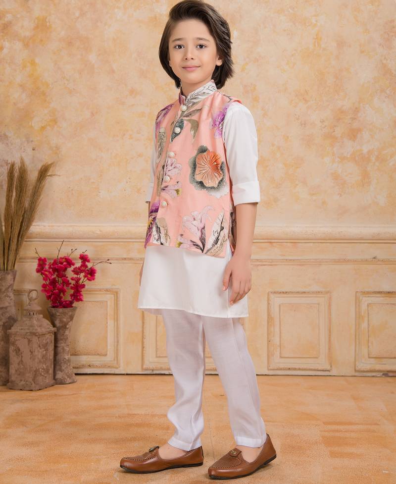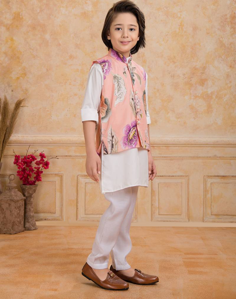 | Product Description | Dress Your Little One In This Elegant Ethnic Ensemble Featuring A Pastel Peach Floral Printed Nehru Jacket Paired With A Classic White Kurta And Payjama. The Jacket Is Adorned With Vibrant Floral Motifs And Pearl Button Detailing, Adding A Festive Charm To The Outfit. Made From Soft, Breathable Fabric, This Set Ensures All Day Comfort While Keeping The Look Traditional Yet Stylish — Perfect For Weddings, Festive Celebrations, Or Family Gatherings. |