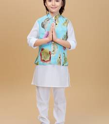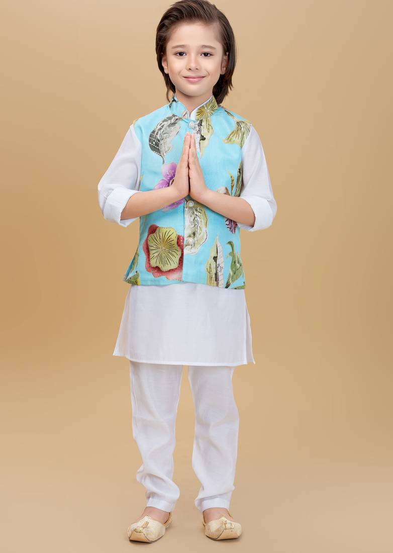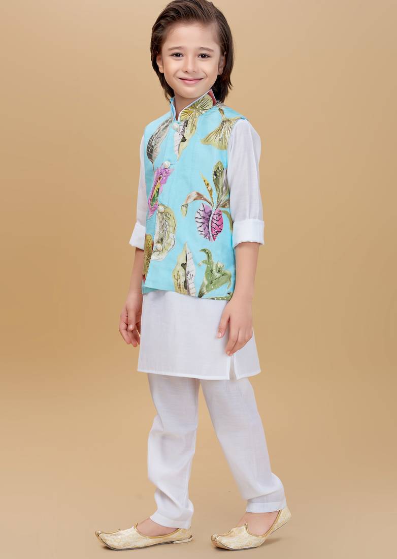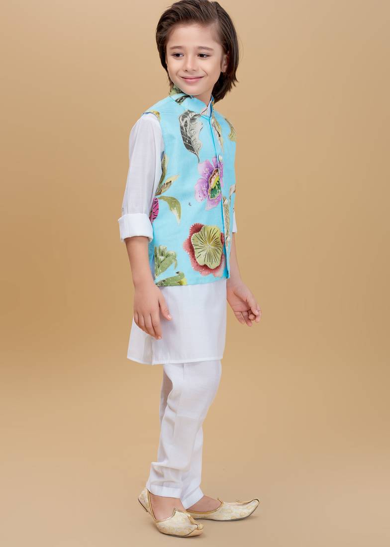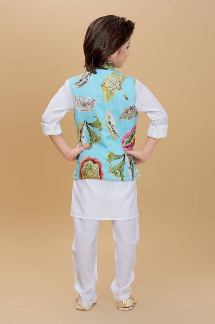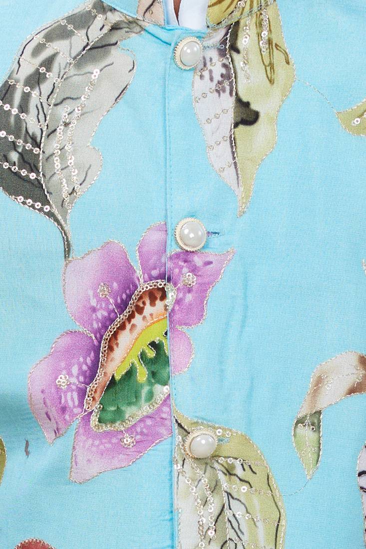 | Product Description | Dress Your Little One In This Elegant Ethnic Ensemble Featuring A Pastel Blue Floral Printed Nehru Jacket Paired With A Classic White Kurta And Payjama. The Jacket Is Adorned With Vibrant Floral Motifs And Pearl Button Detailing, Adding A Festive Charm To The Outfit. Made From Soft, Breathable Fabric, This Set Ensures All Day Comfort While Keeping The Look Traditional Yet Stylish — Perfect For Weddings, Festive Celebrations, Or Family Gatherings. |