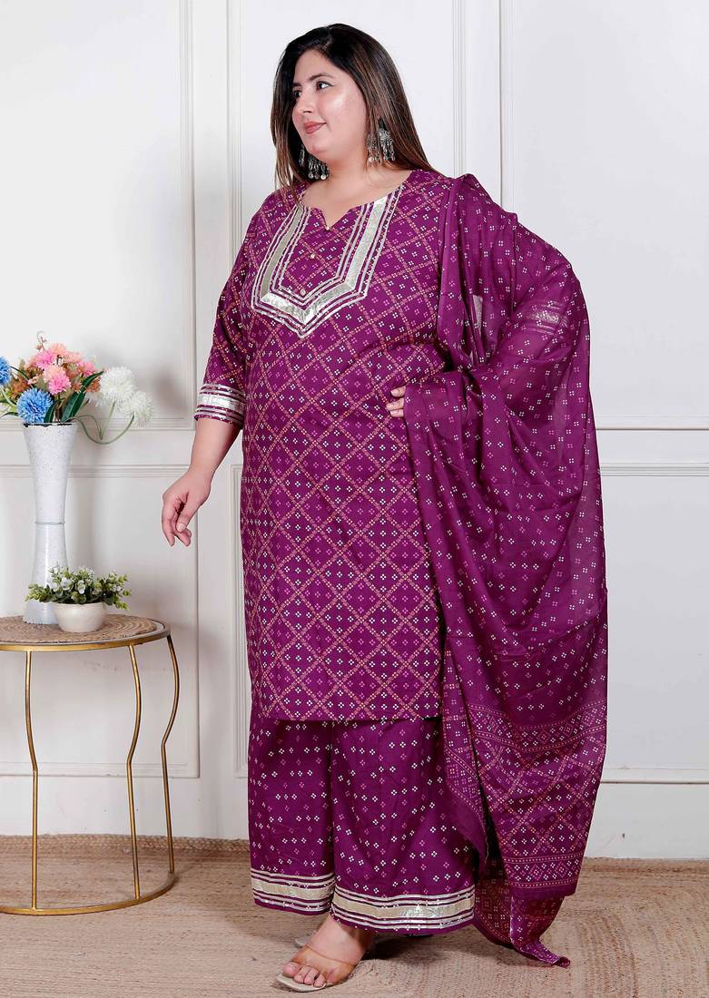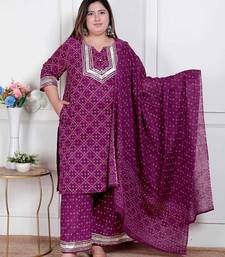 plus size magenta embroidered cotton kurta with palazzo and dupatta stitched