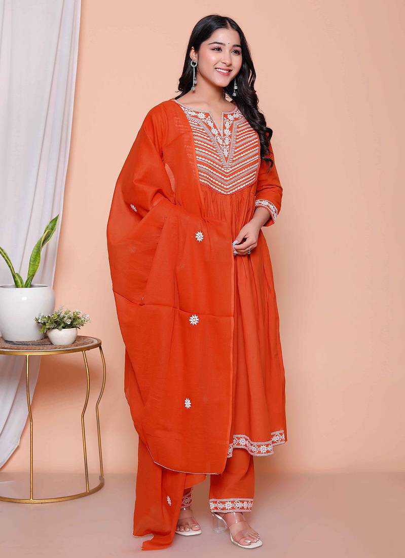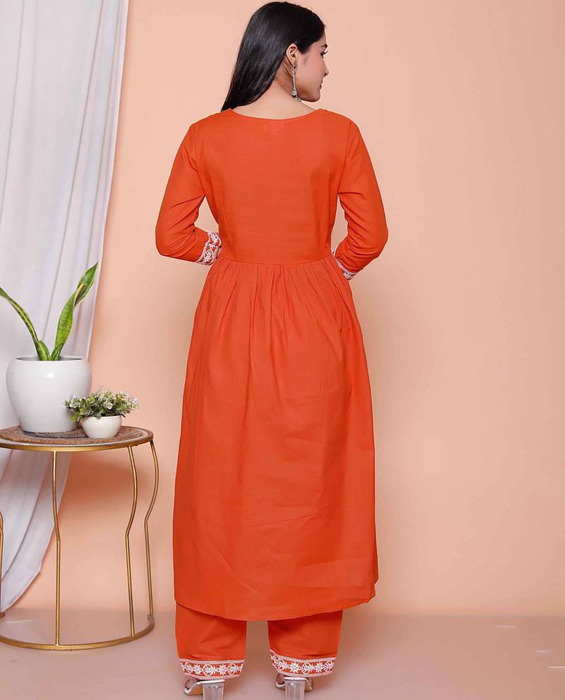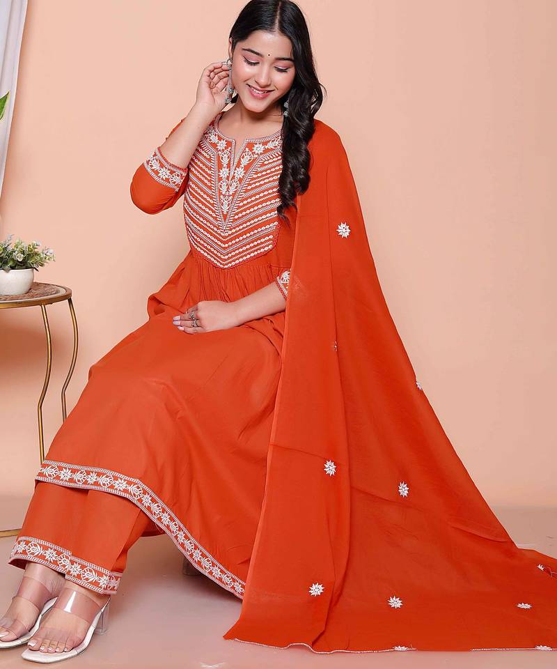 | Product Name | Womens Floral Embroidered Rust Straight Cotton Kurta & Palazzo With Dupatta Set | |