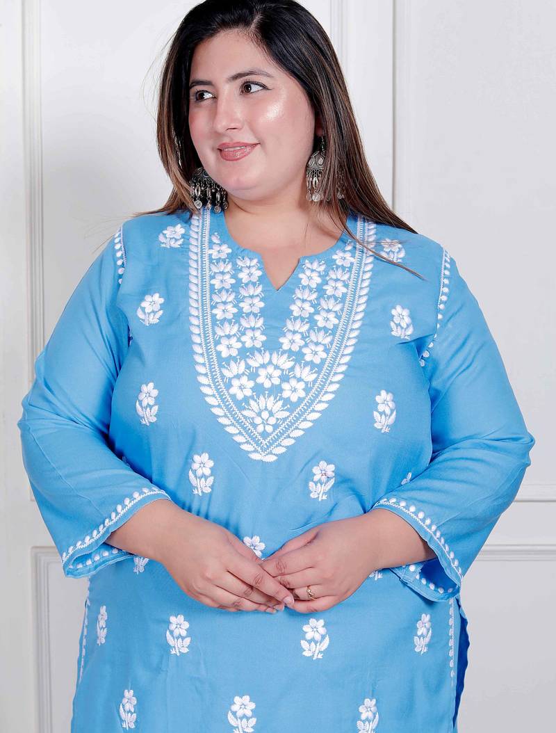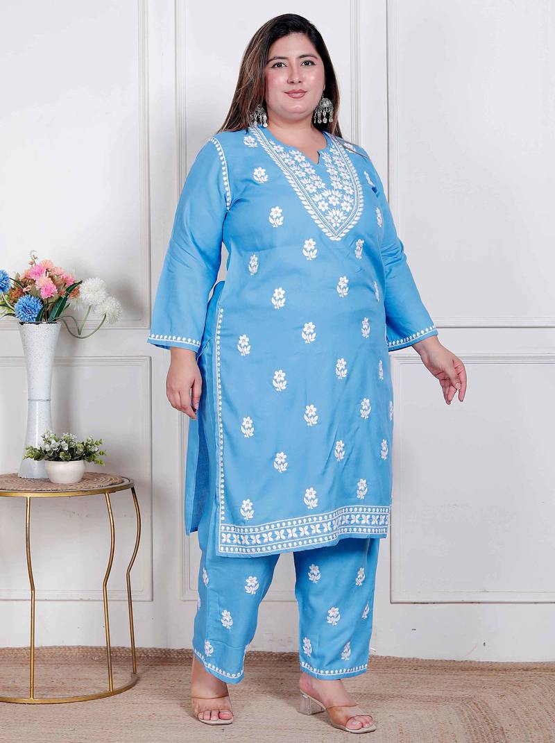 womens plus size blue embroidered kurta with palazzo stitched