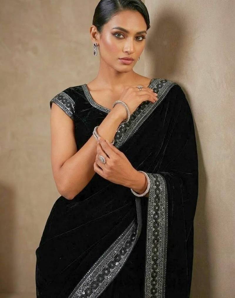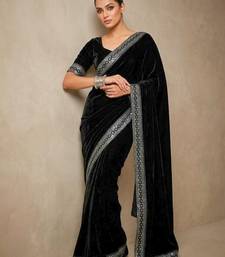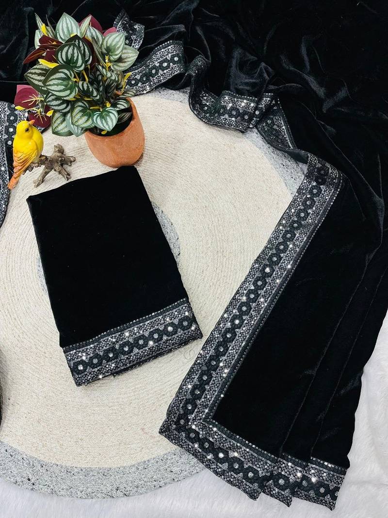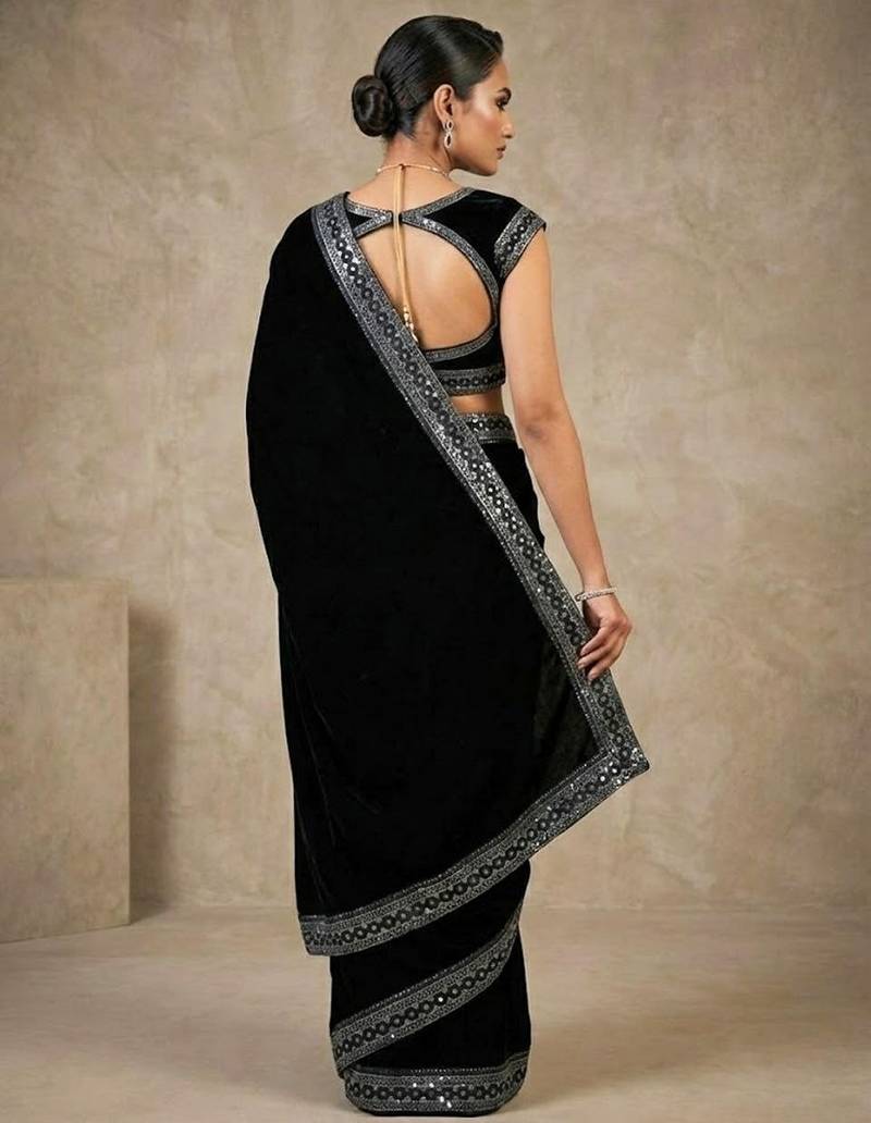 Black bloue piece with embroidred velvet saree
