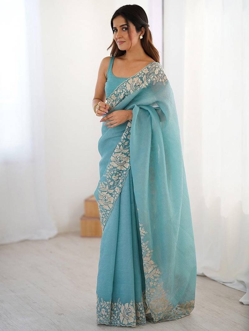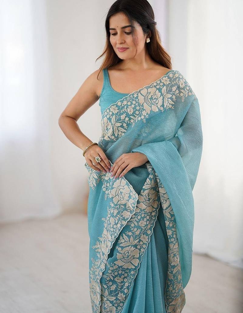| Product Description | Candy Crush Saree & Blouse Fabric. Blouse & Saree Both Come With Malti Thread Embroidery Work With Cutwork Border |