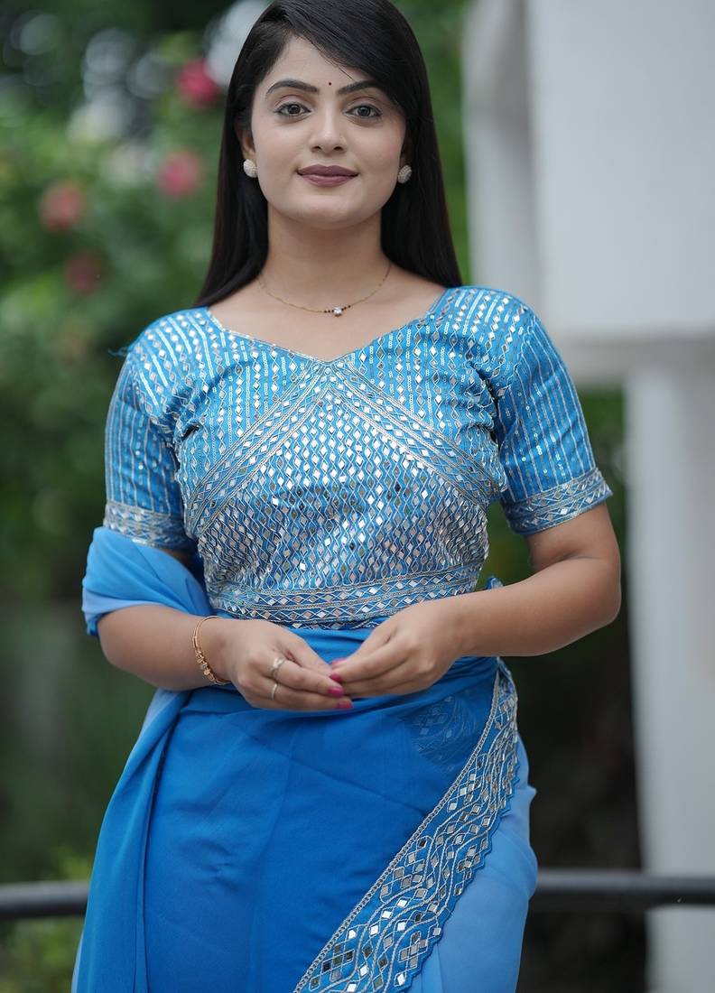 | Product Description | Faux Georgatte Saree Fabruic With Padding Pattern With Embroidered Lace With Rweal Mirror Work. Blouse Come With Mono Diamond Silk Saree With Embroidery Work With Real Mirror Work |