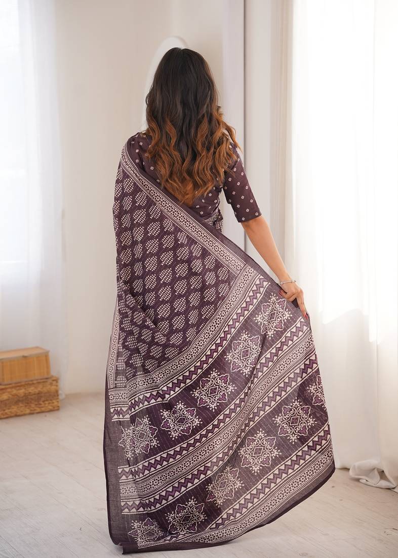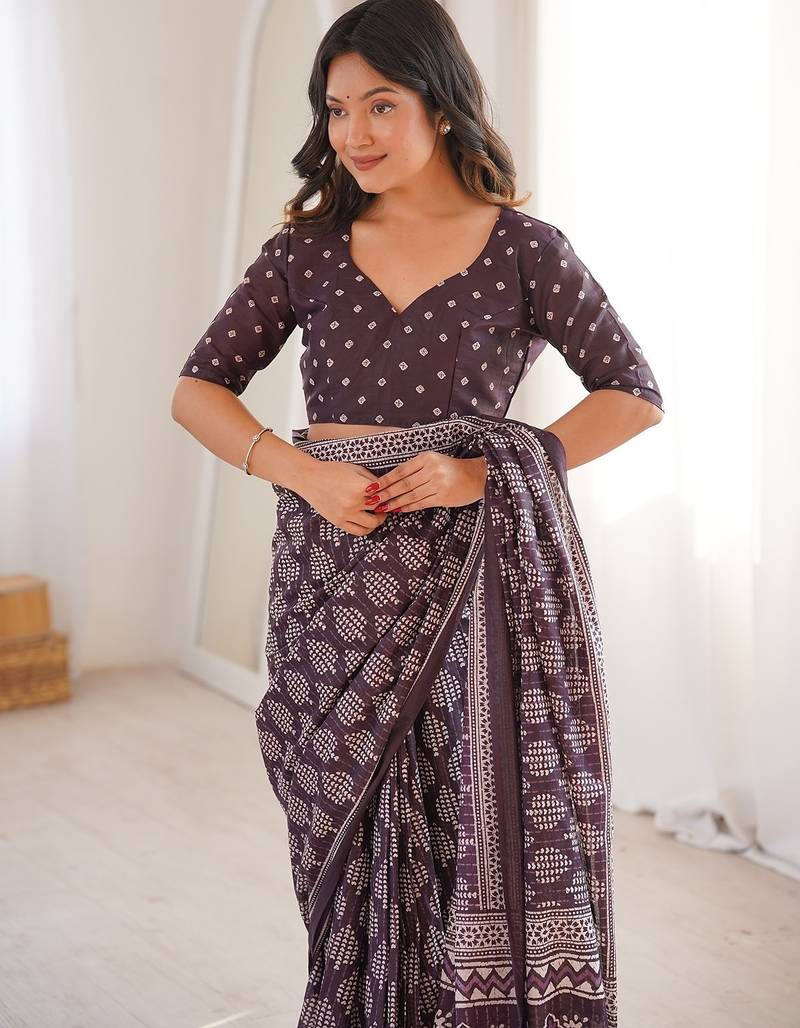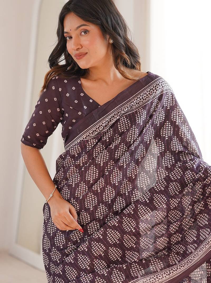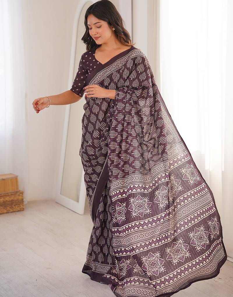 Brown bloue piece with cotton printed saree