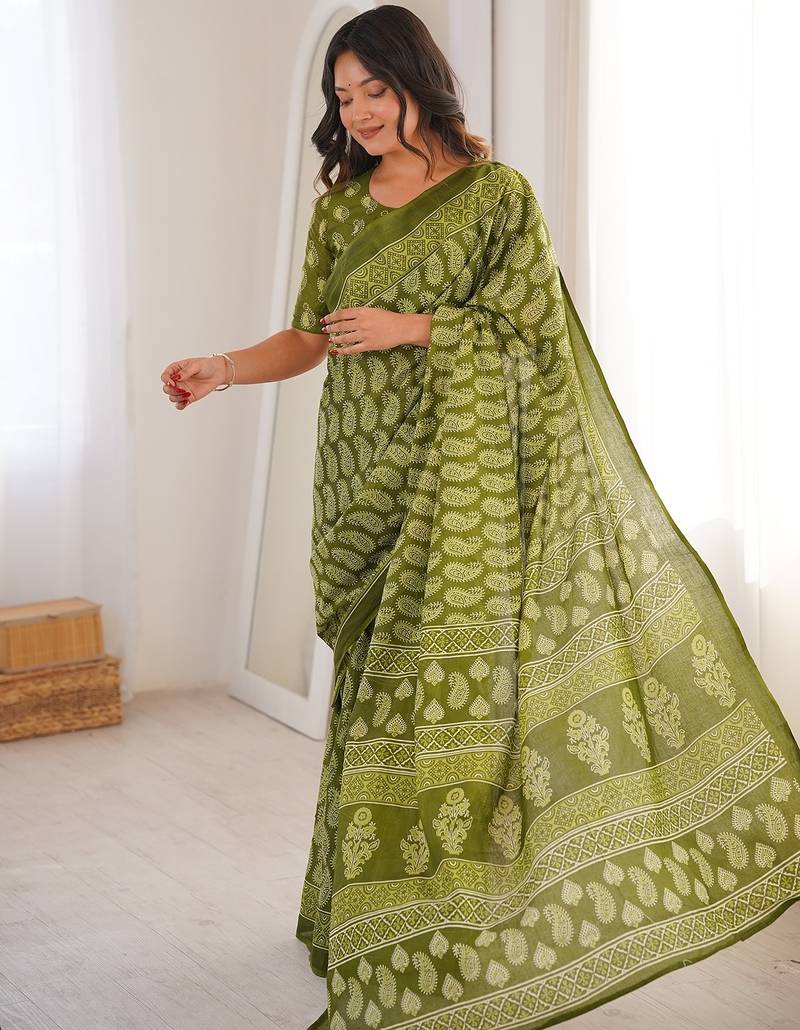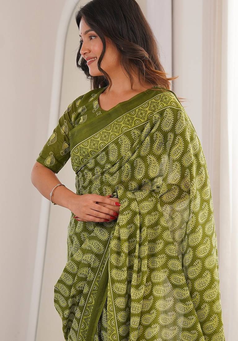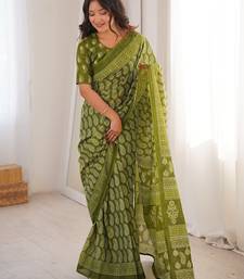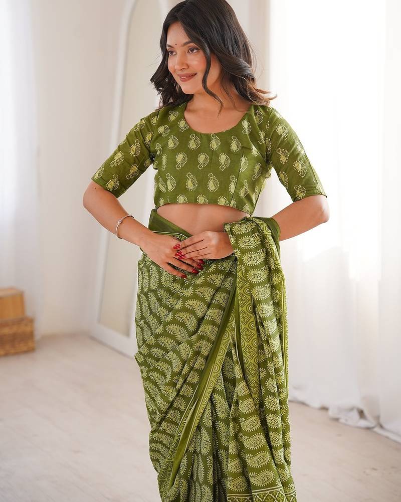 Green bloue piece with cotton printed saree