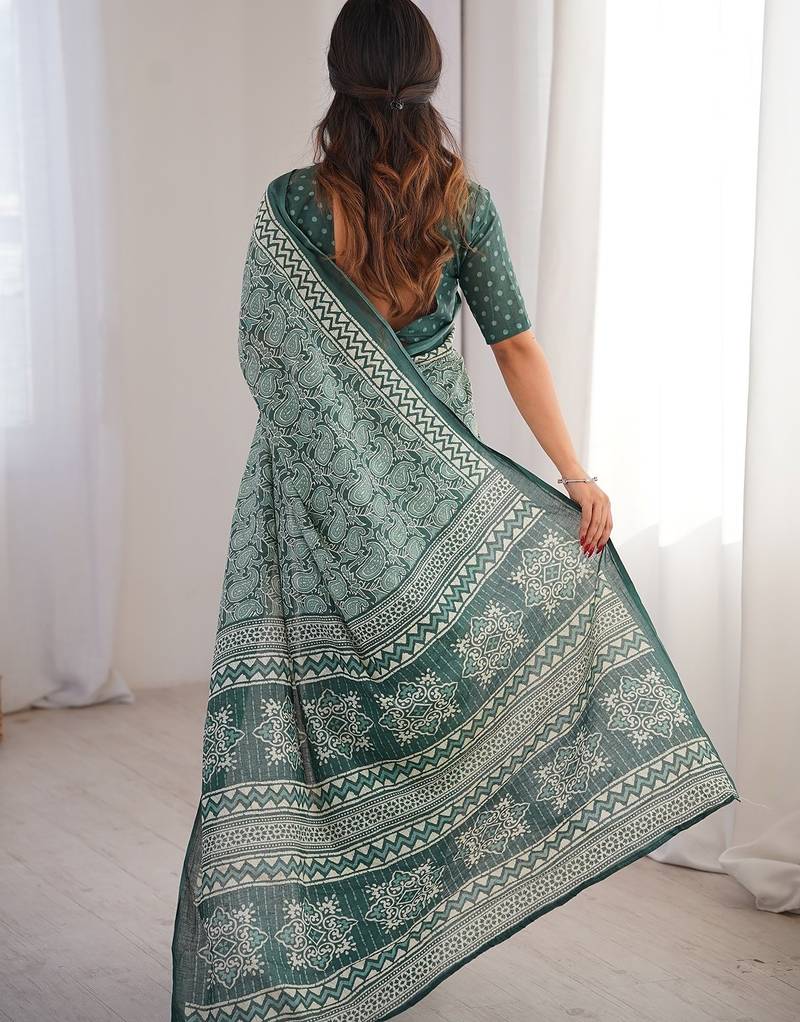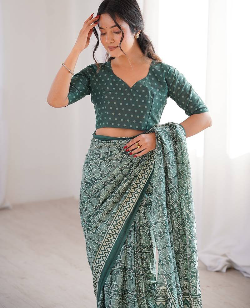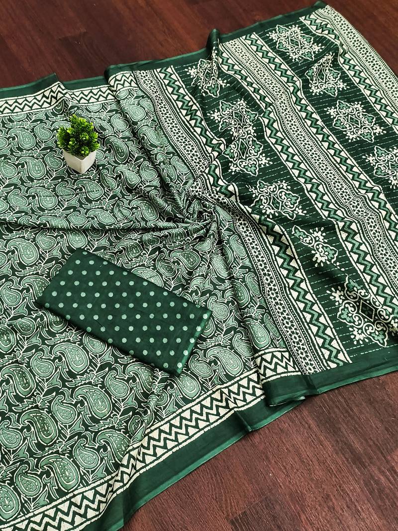 Green bloue piece with cotton printed saree