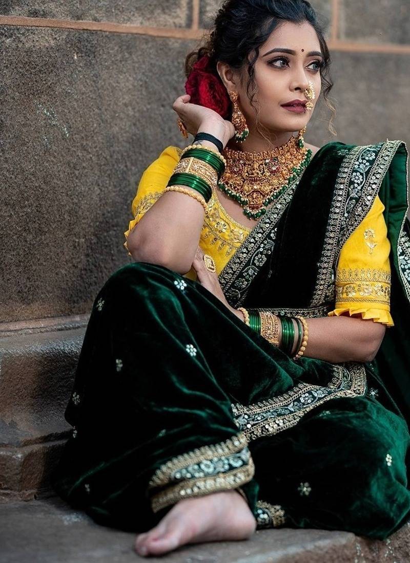 Saree : Color- Green / Fabric- Velvet
