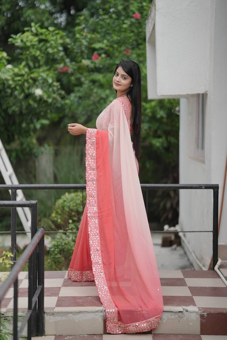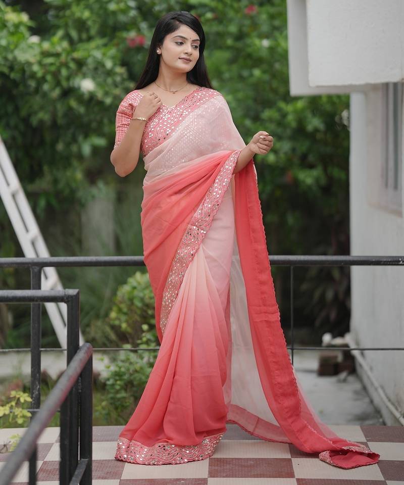 | • | Saree | : | Color- Peach / Fabric- Faux Georgette |