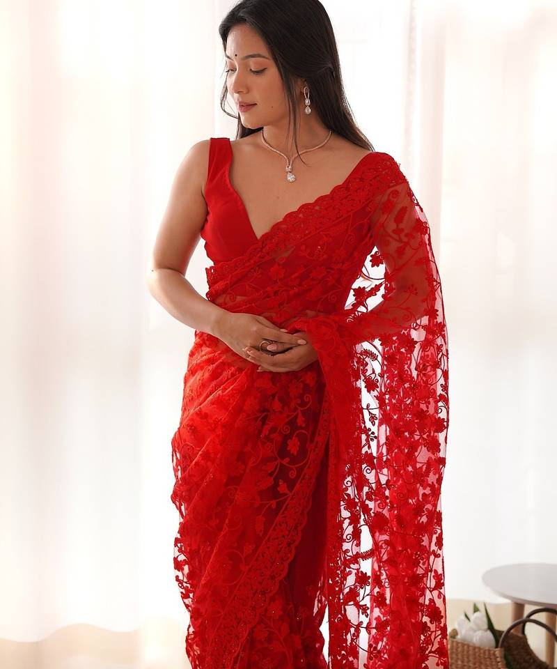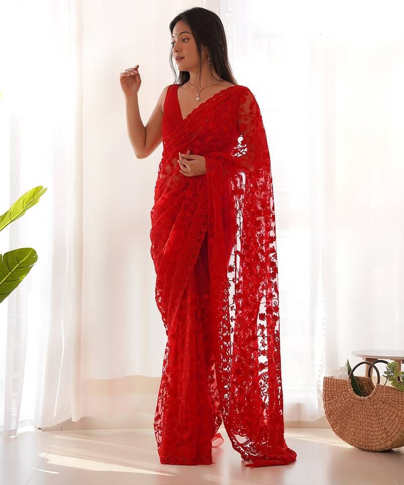 | • | Saree | : | Color- Red / Fabric- Net |