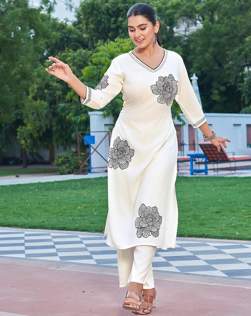 Floral embroidered v-neck thread work straight kurta with palazzo