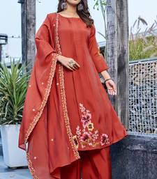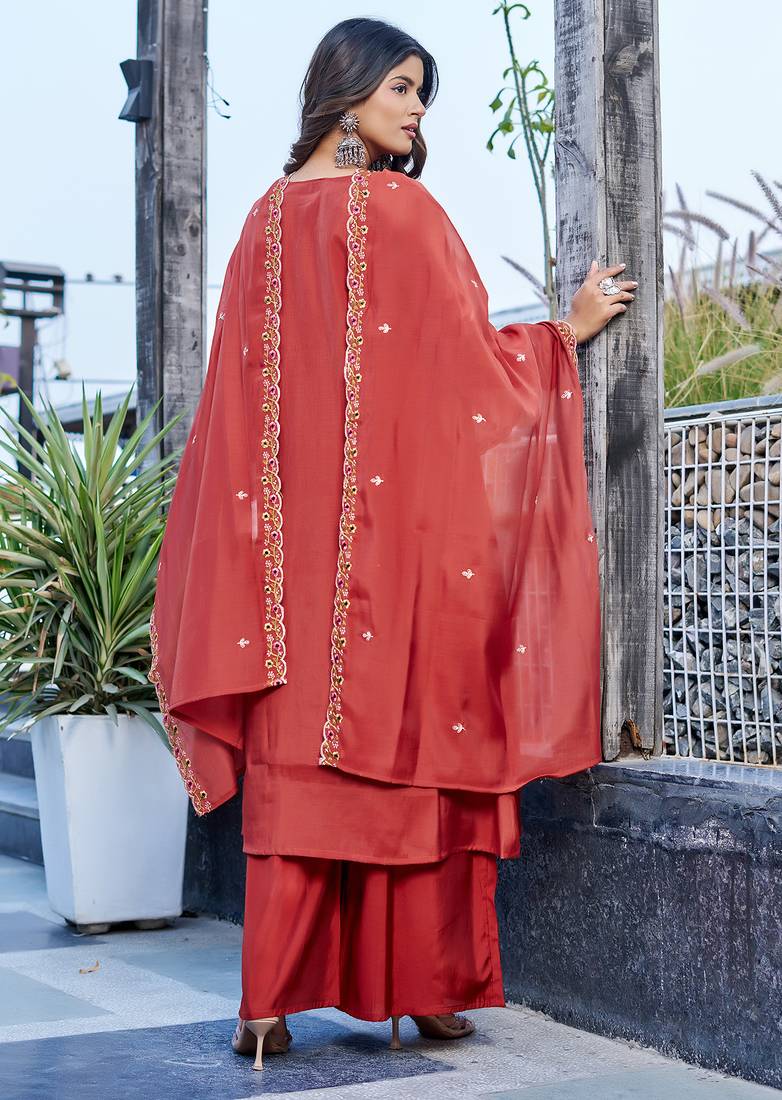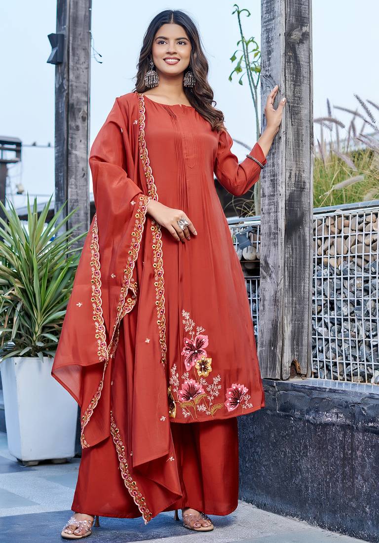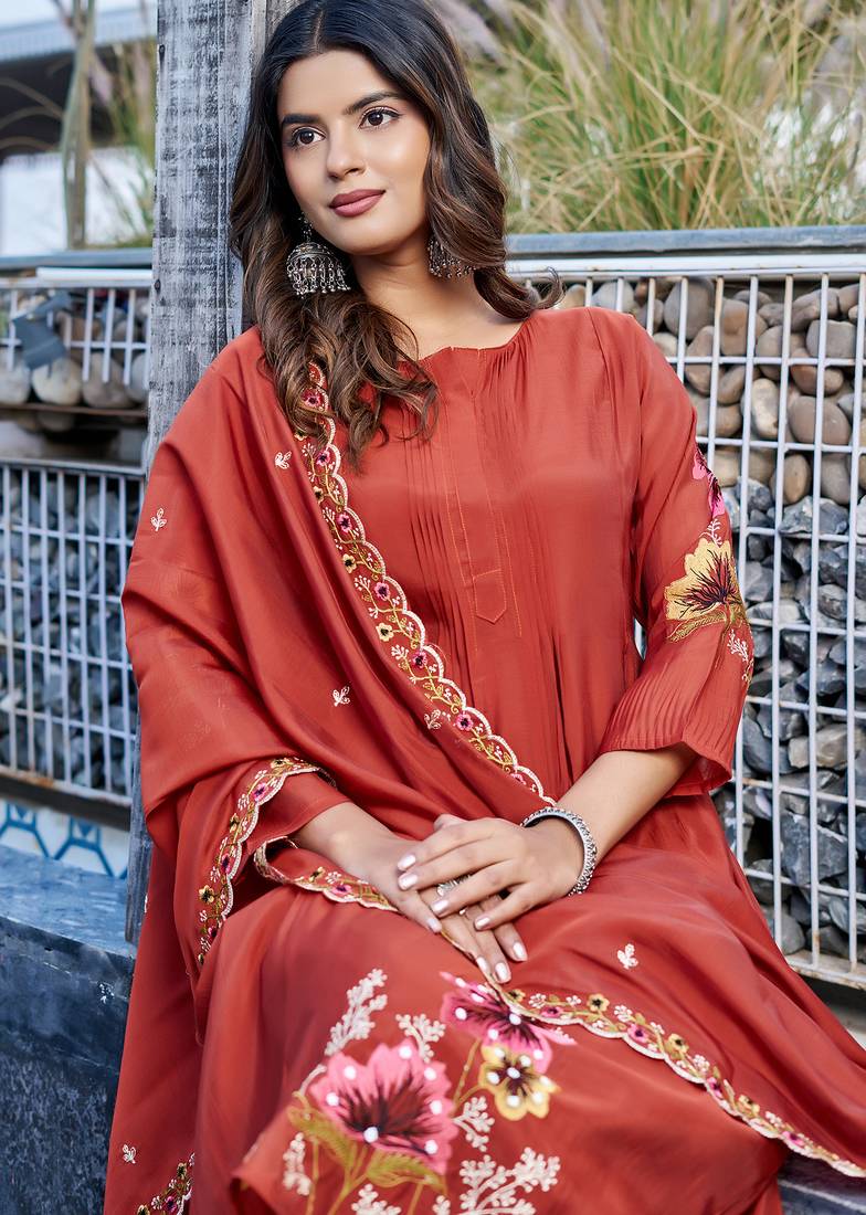 Women embroidered thread work mull chanderi kurta with palazzo & with dupatta