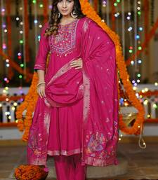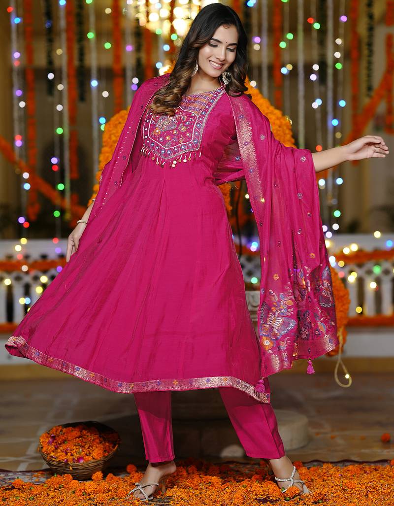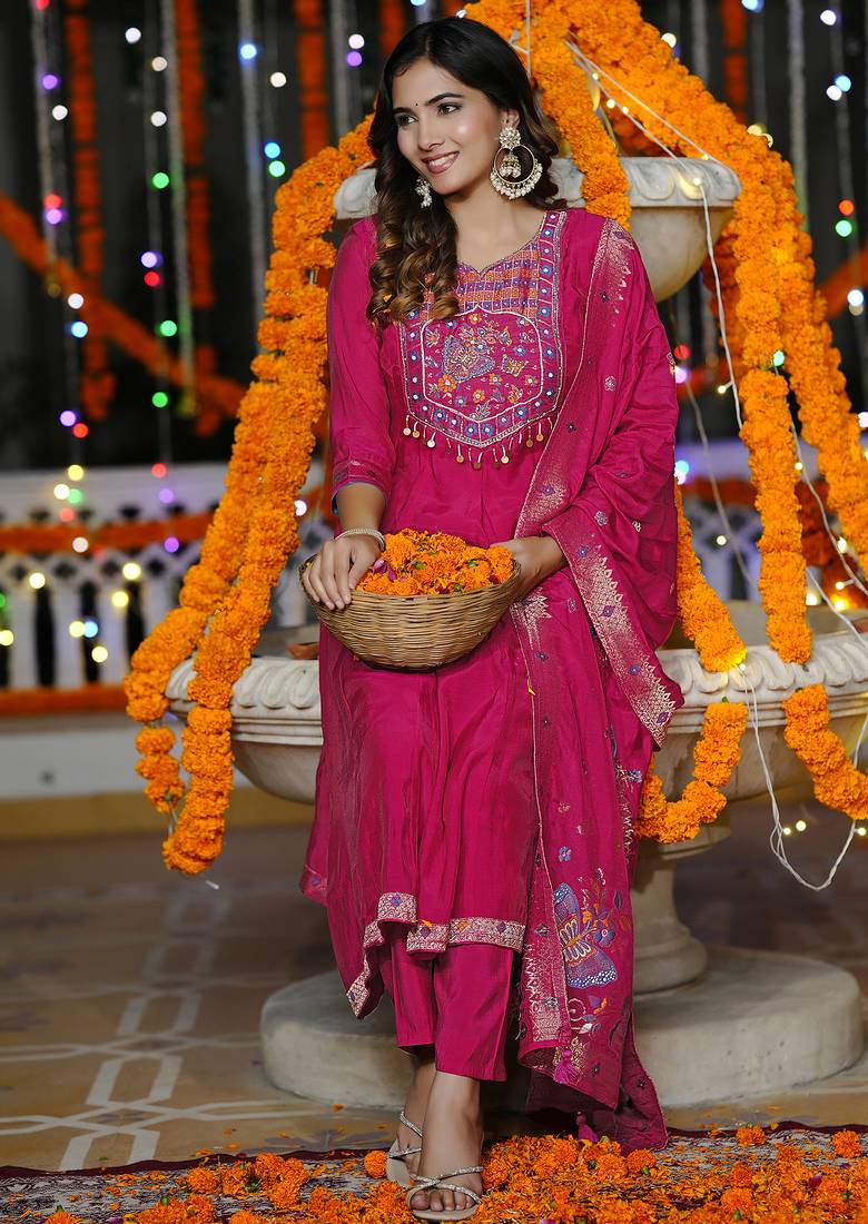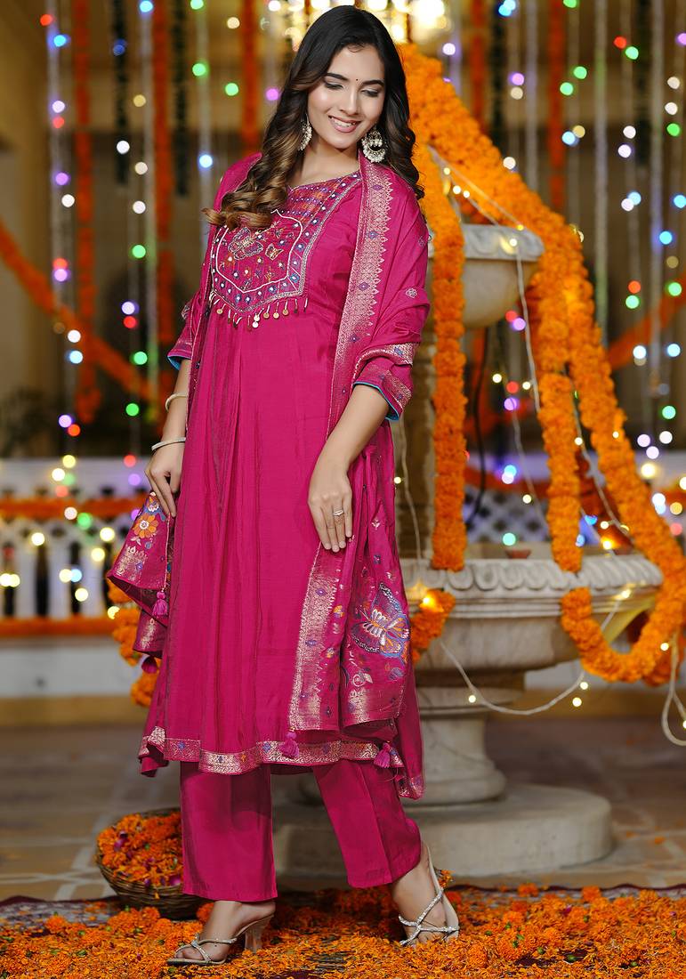 Women mul chanderi & khatli work kurta with trouser & with dupatta