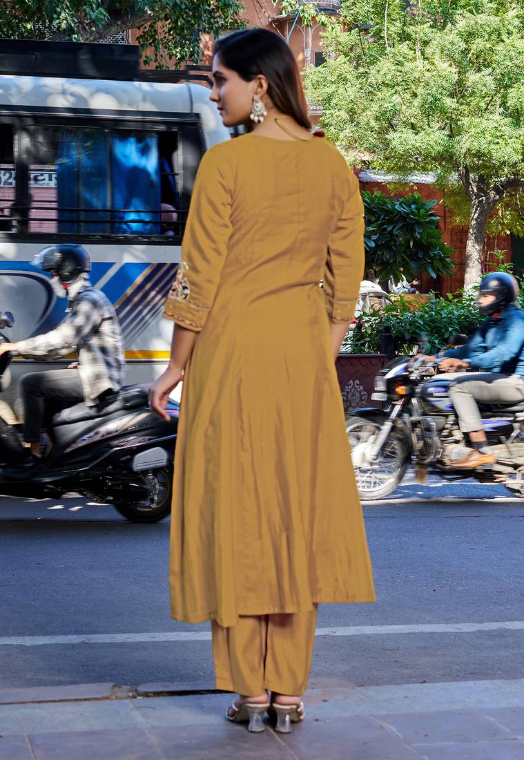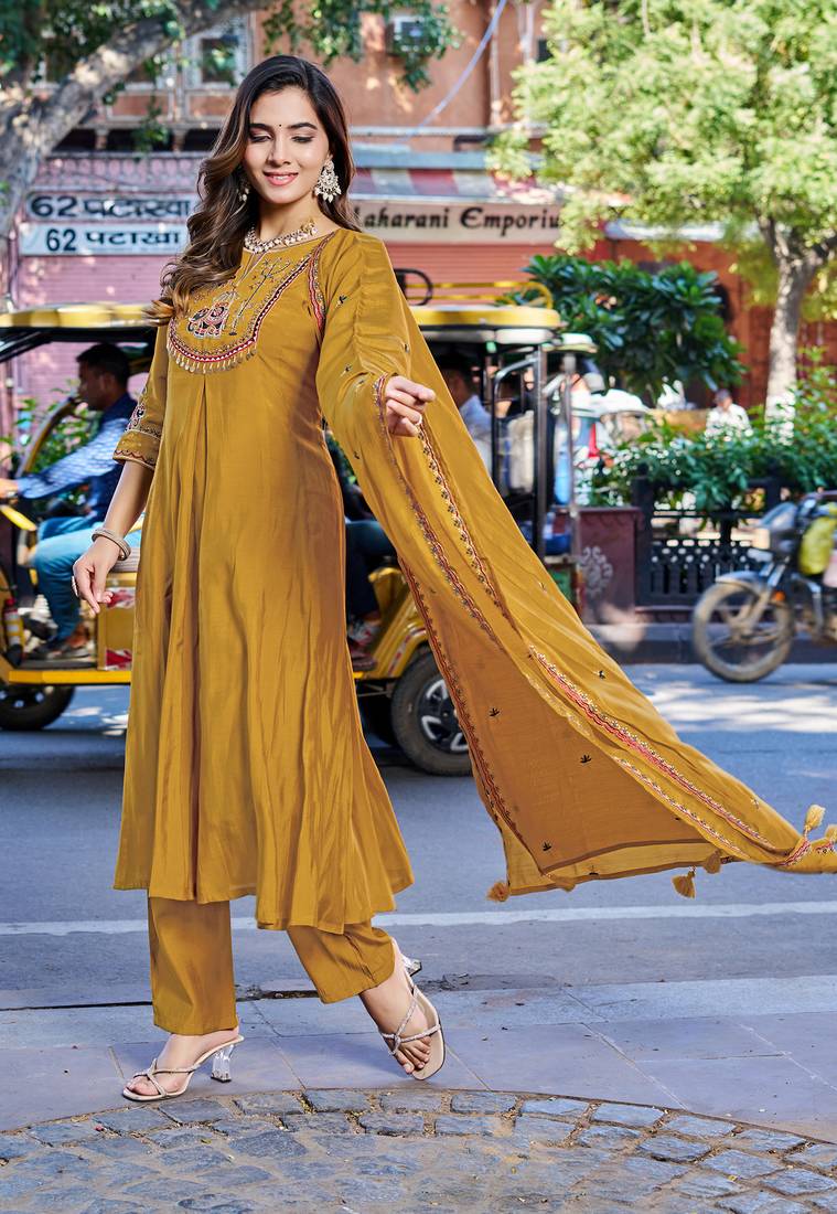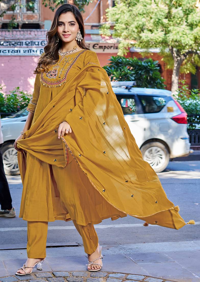 Women mul chanderi with thread work & khatli work kurta with trouser & with dupatta