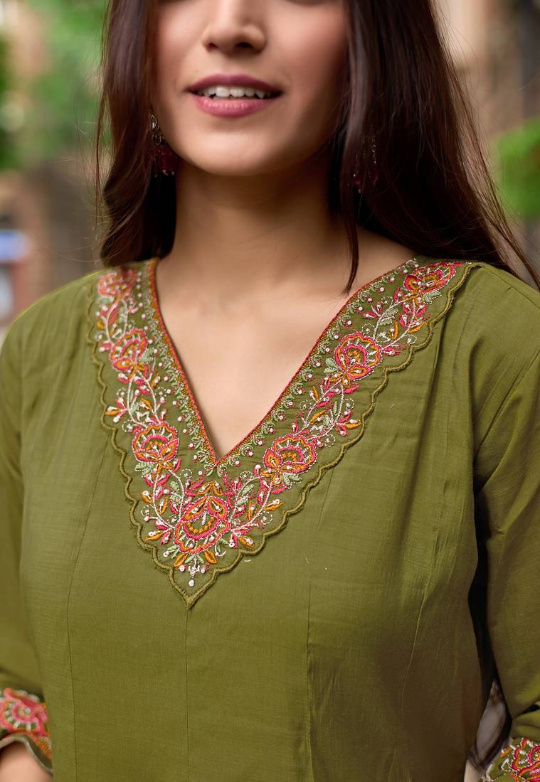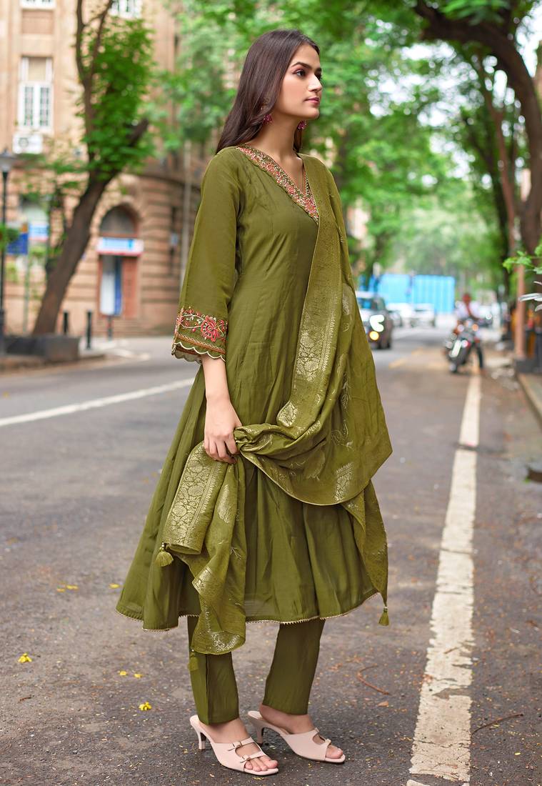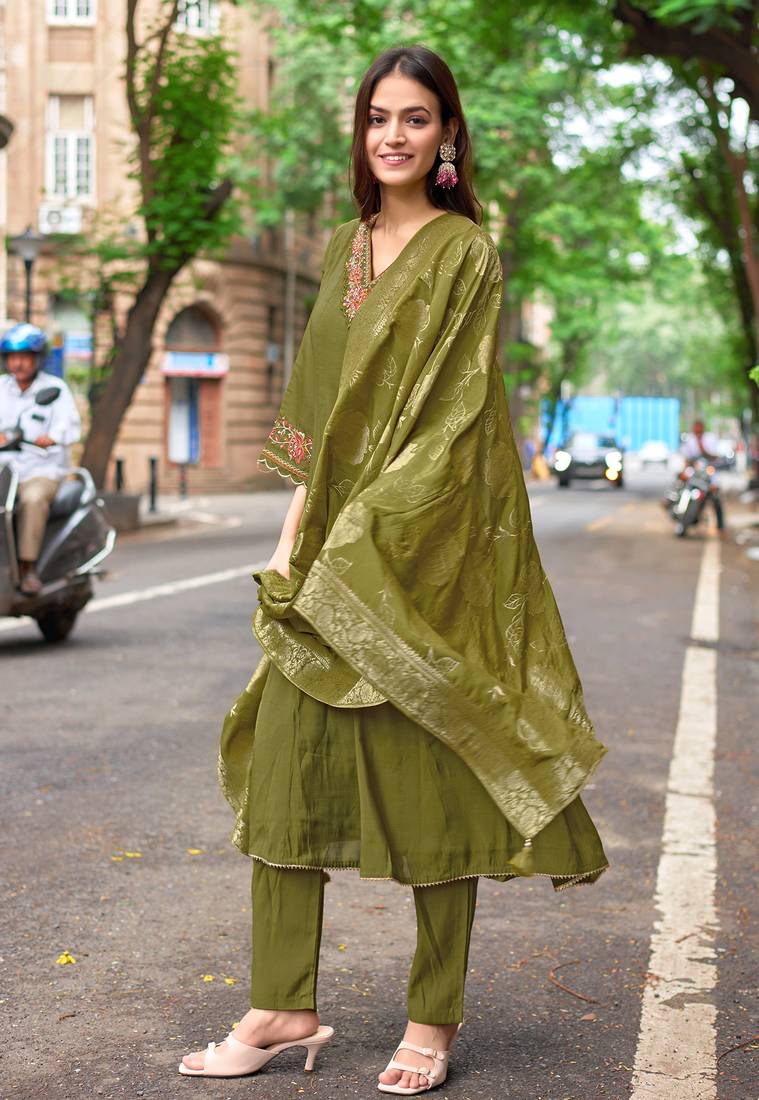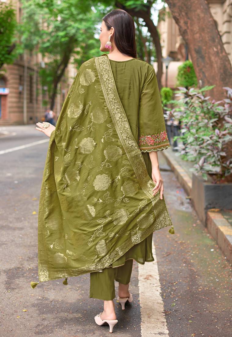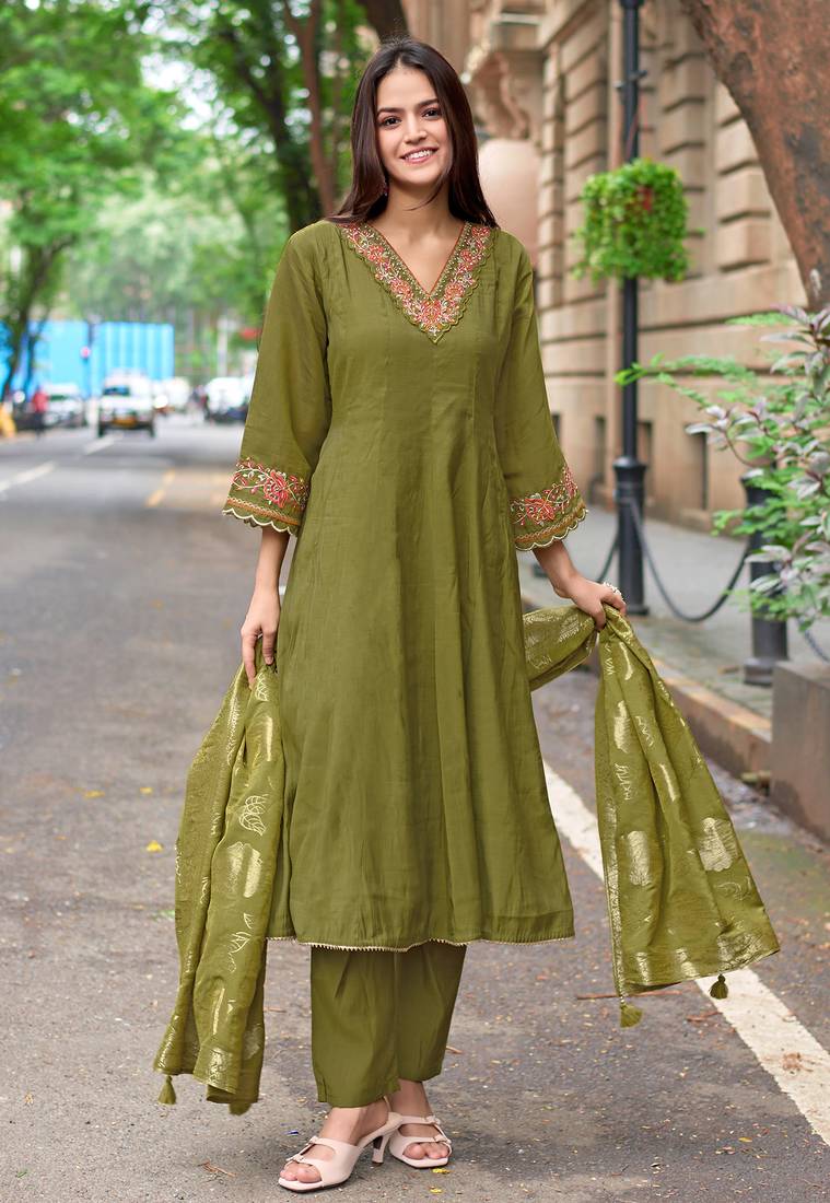 Women mull chanderi embroidered regular kurta with trousers & with dupatta