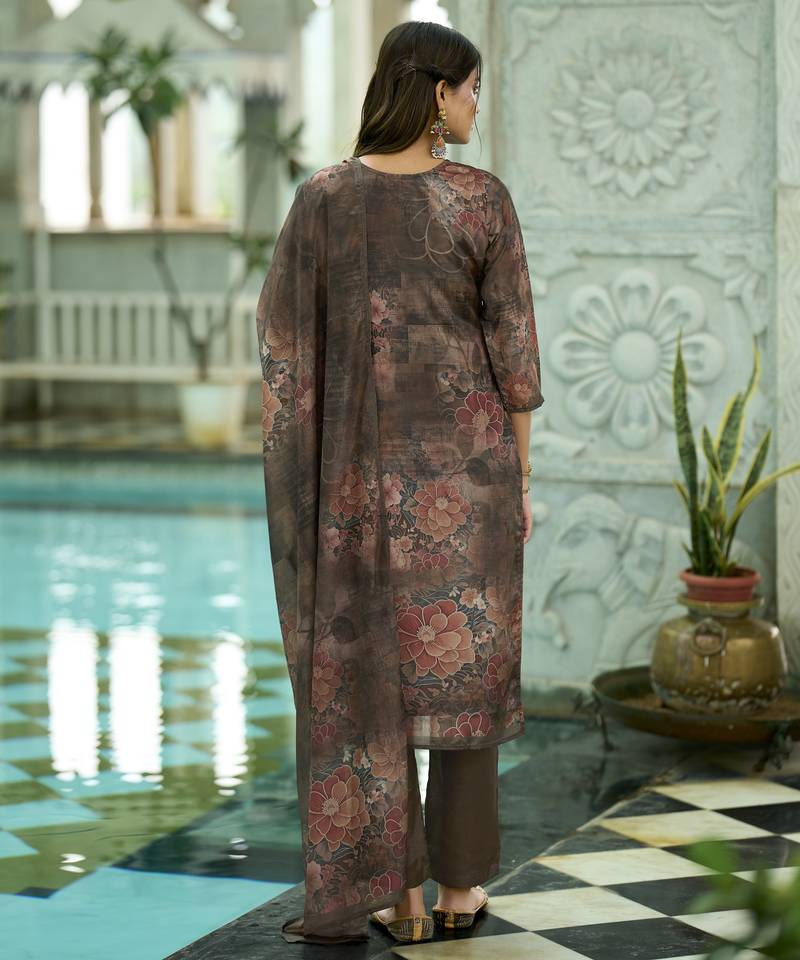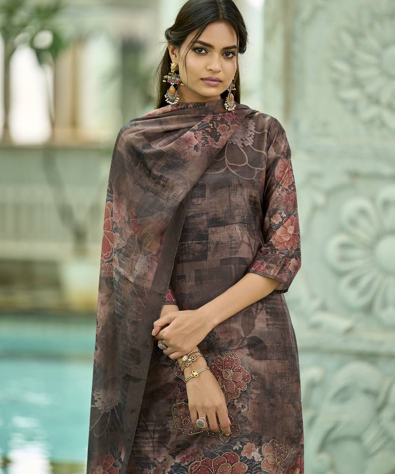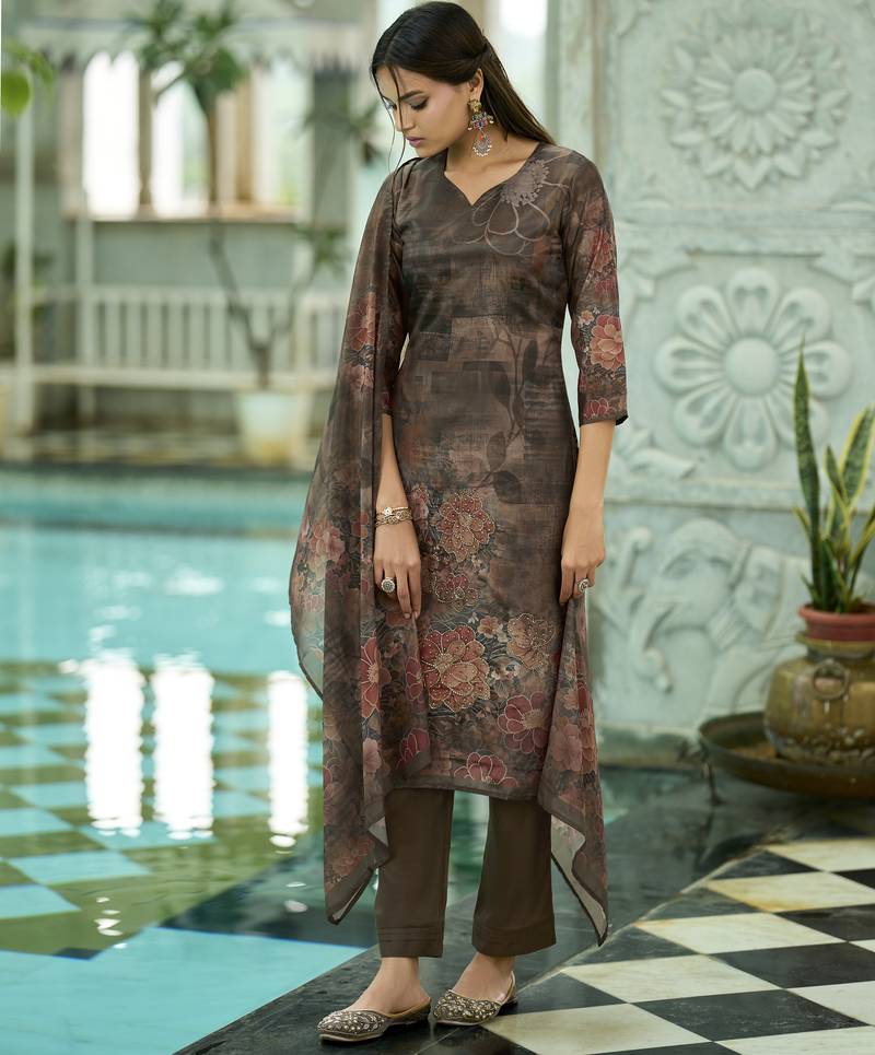 Product Name | Brown Ho Organza Floral Printed Straight Kurta With Pant & Printed Dupatta | |