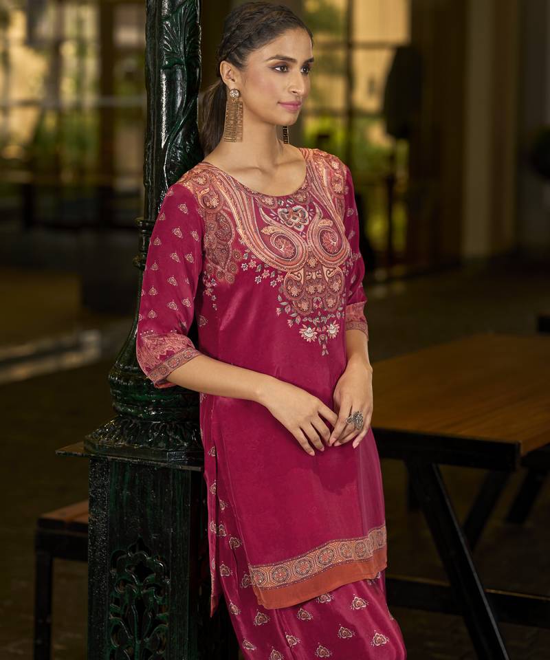 Product Description | Vibrant Fuchsia Pink Pure Crepe Co Ord Set Featuring An Abstract Print Straight Tunic Enhanced With Delicate Beadwork. Teamed With A Fully Elasticated Printed Palazzo For All Day Comfort And Effortless Style. Perfect For Festive Occasions, Parties, And Special Gatherings, This Ensemble Blends Bold Color With Graceful Design For A Standout Look. |